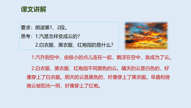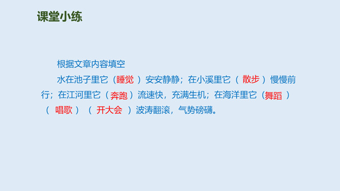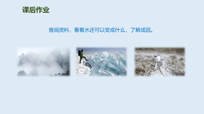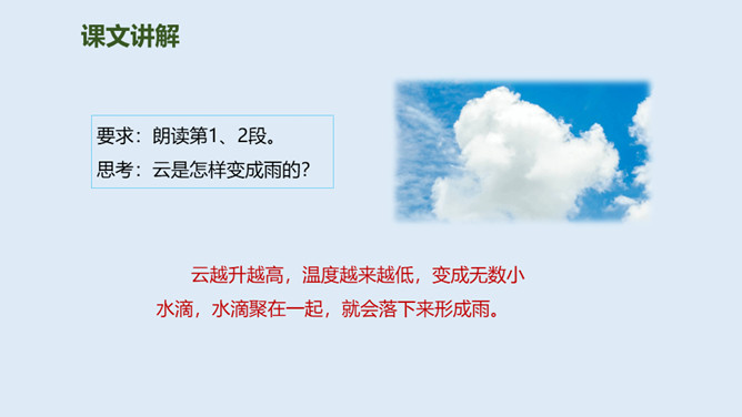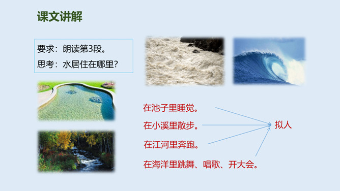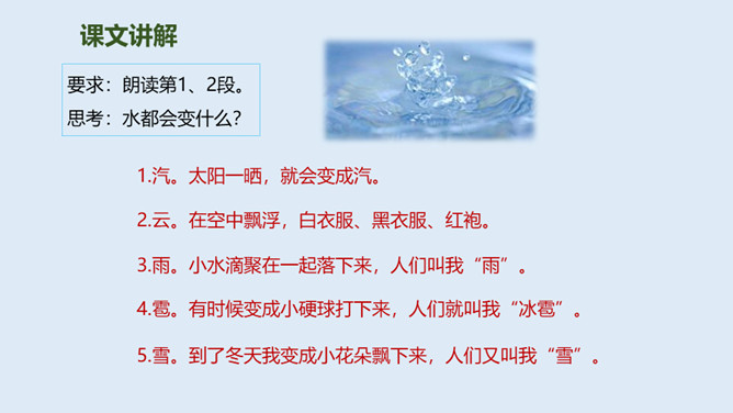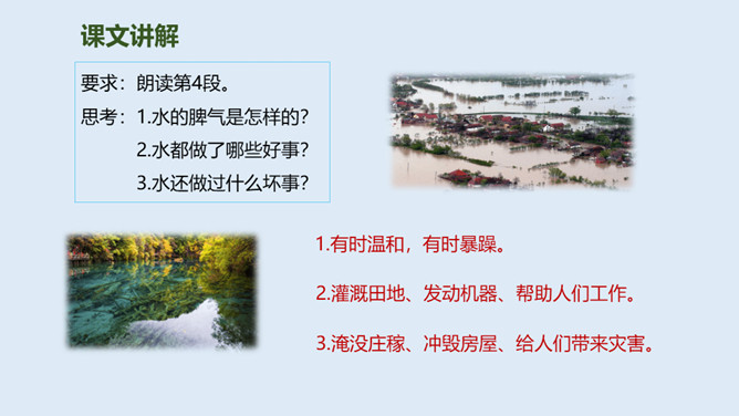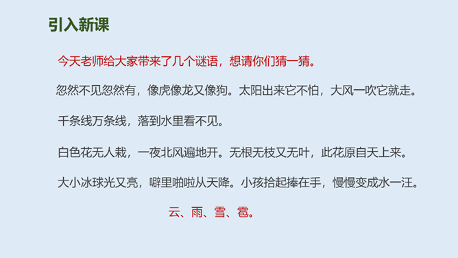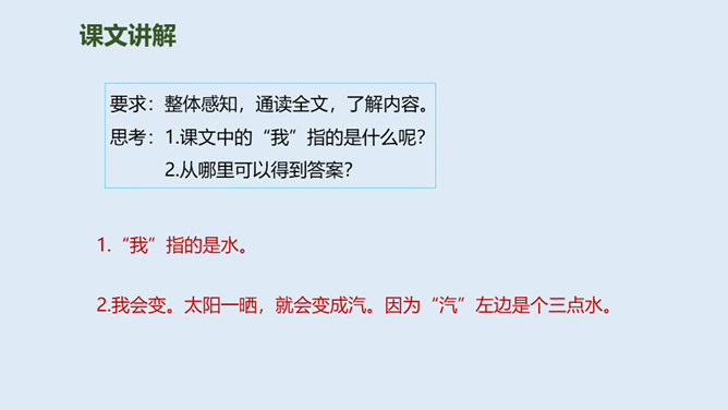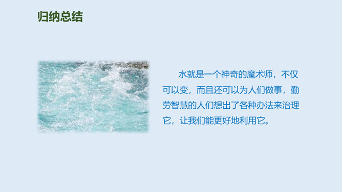 引入新课:今天老师给大家带来了几个谜语,想请你们猜一猜。忽然不见忽然有,像虎像龙又像狗。太阳出来它不怕,大风一吹它就走。白色花无人栽,一夜北风遍地开。无根无枝又无叶,此花原自天上来。要求:整体感知,通读全文,了解内容。思考:1.课文中的“我”指的是什么呢?2.从哪里可以得到答案?水就是一个神奇的魔术师,不仅可以变,而且还可以为人们做事,勤劳智慧的人们想出了各种办法来治理它,让我们能更好地利用它。所属专题:我是什么ppt。