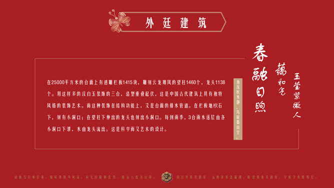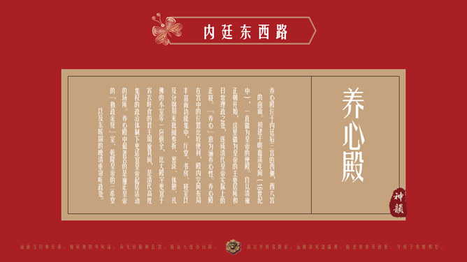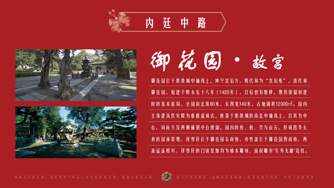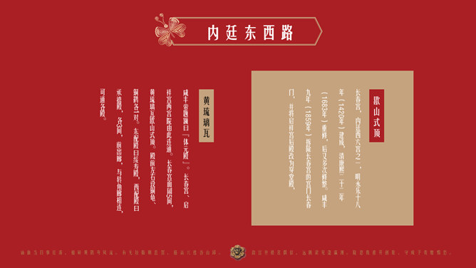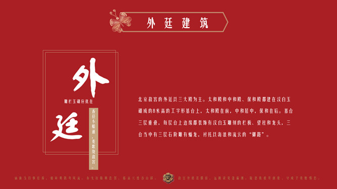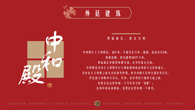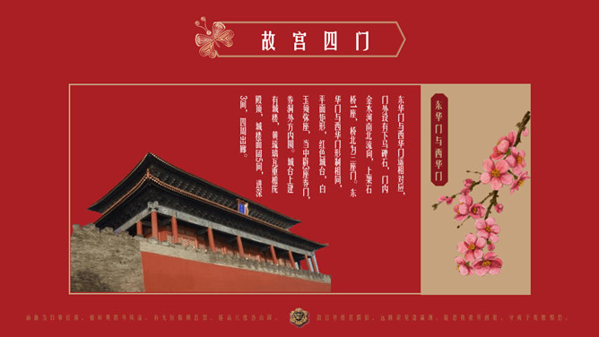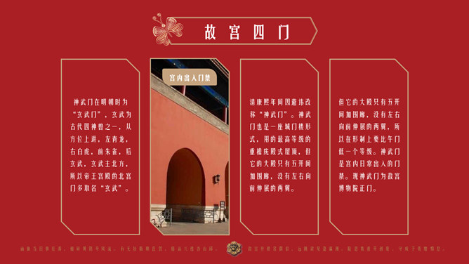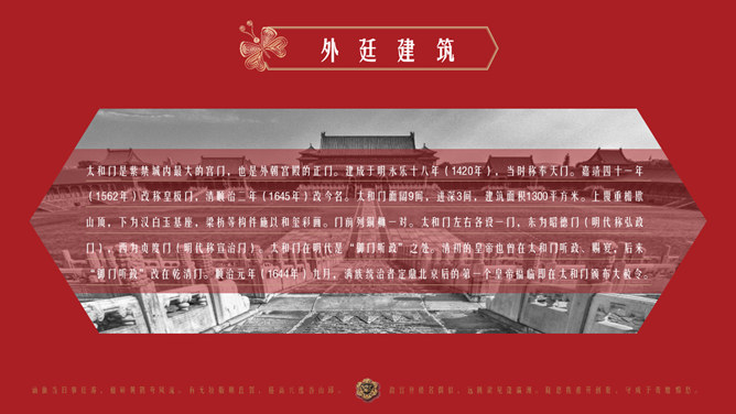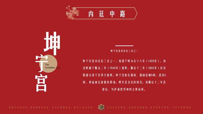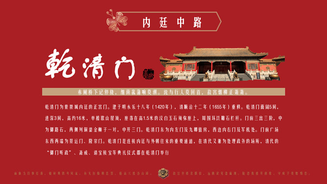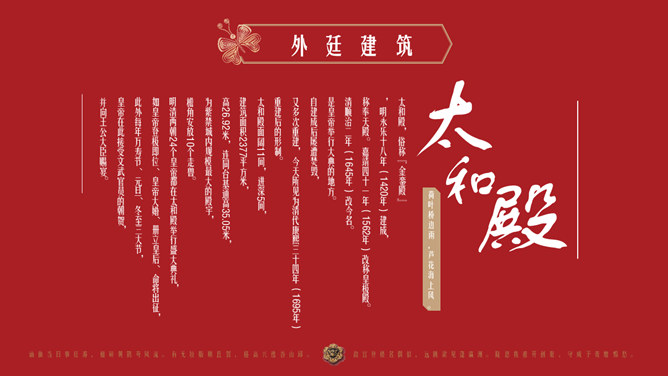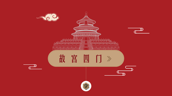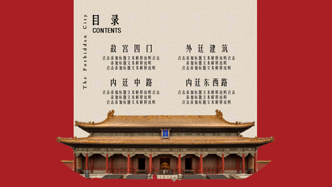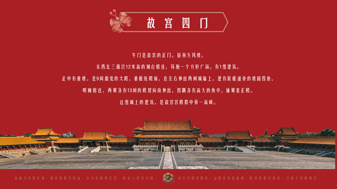 大气故宫介绍简介PPT模板。一套紫禁城故宫简介幻灯片模板,大气朱红色色调,适合故宫建筑布局、历史文化相关内容。