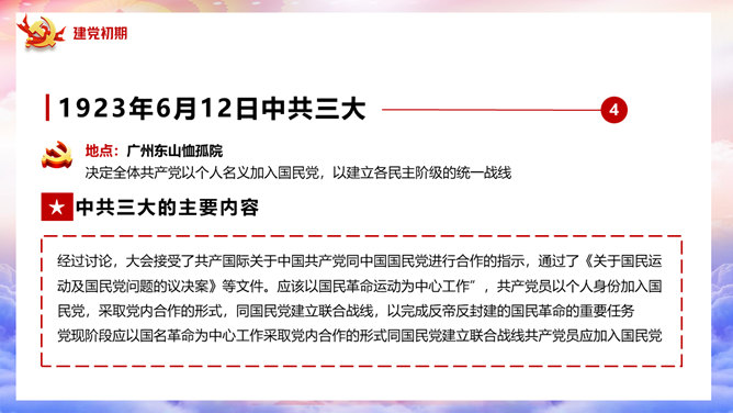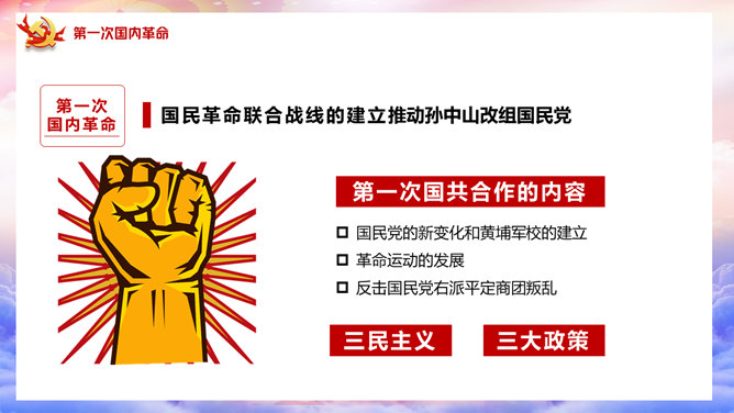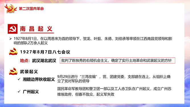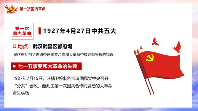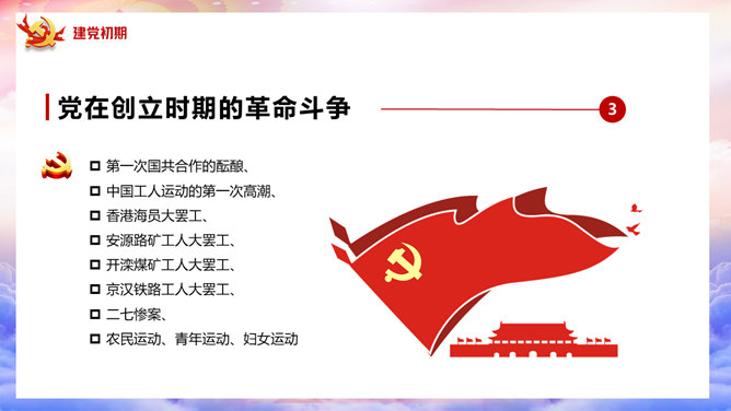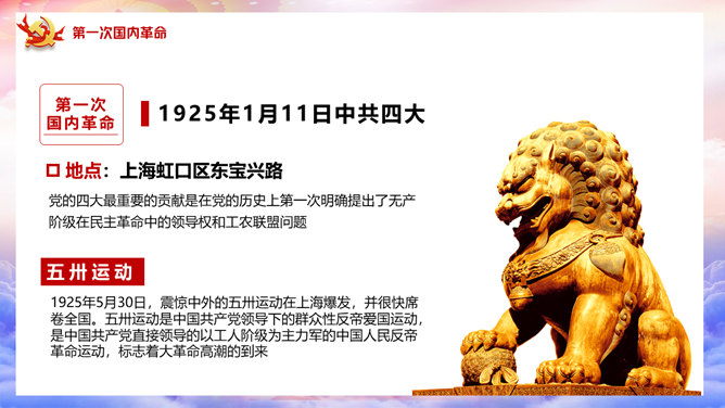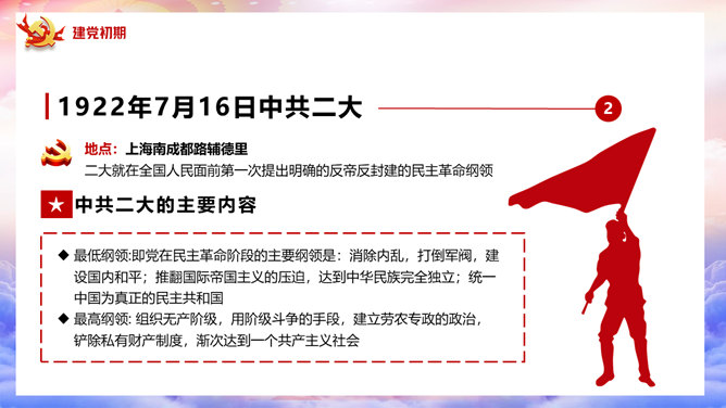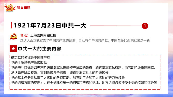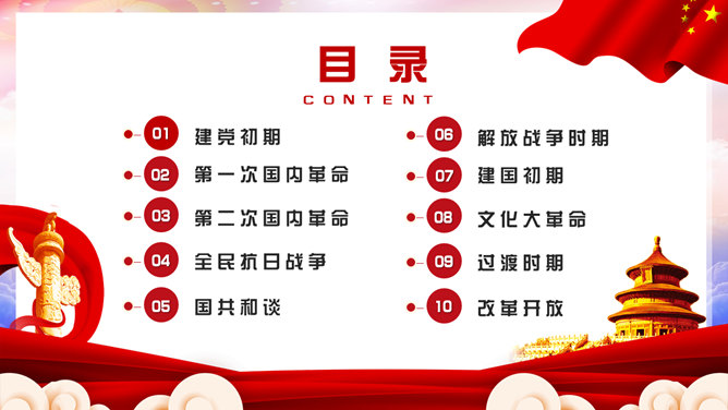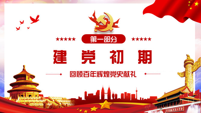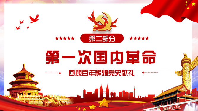 百年党史建党100周年PPT模板。一套庆祝建党一百周年模板,回顾百年党史,包括建党初期、第一次国内革命、第二次国内革命、全民抗日战争、国共和谈、解放战争时期、建国初期、文化大革命、过渡时期、改革开放几个部分。