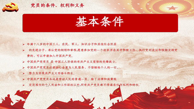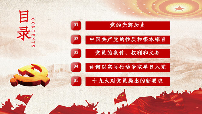 入党积极分子选拔培训PPT模板。党的光辉历史、性质和根本宗旨、党员的条件、权利和义务、如何以实际行动争取早日入党、十九大对党员提出的新要求。