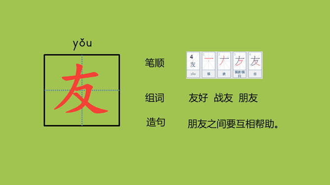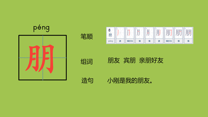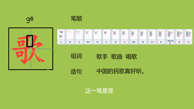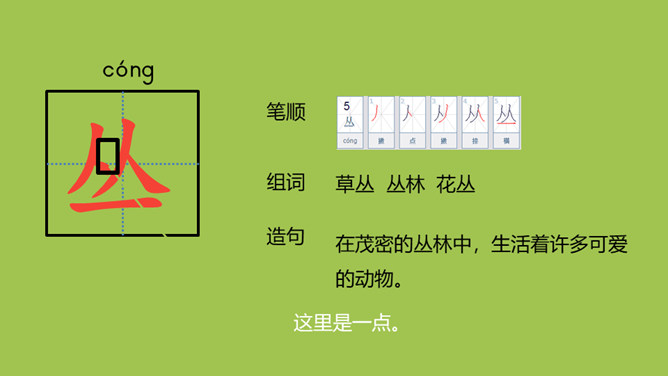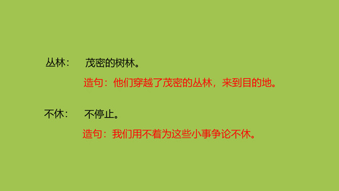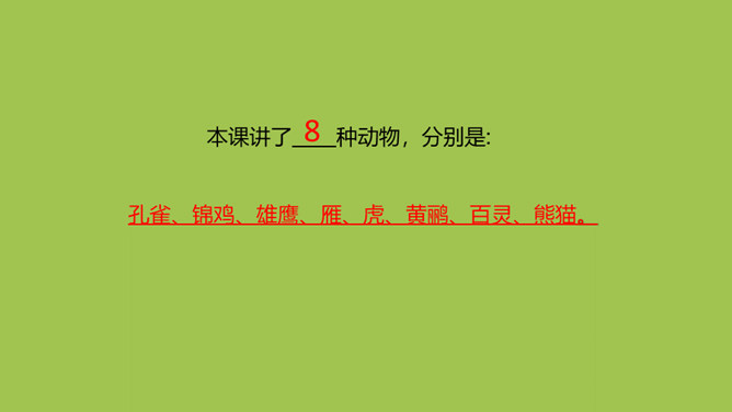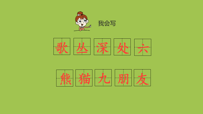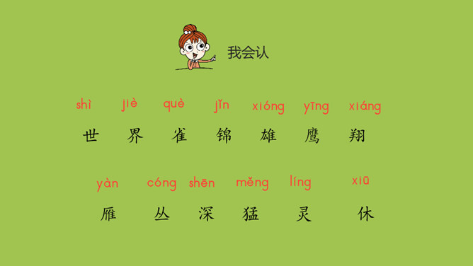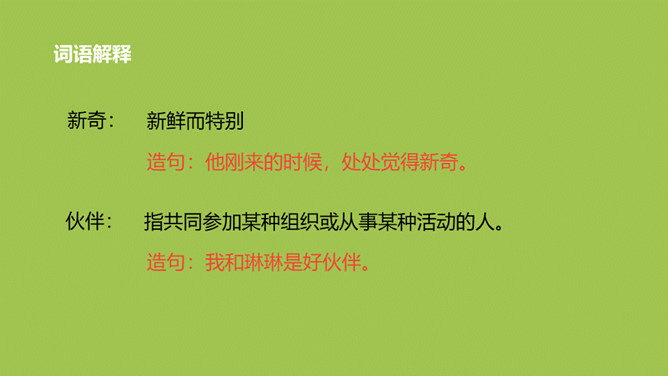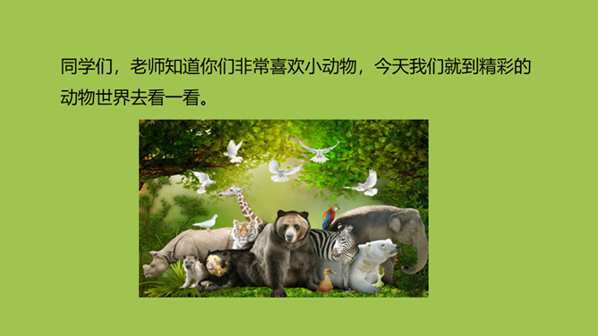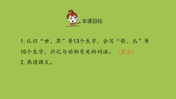 本课目标:1.认识“世、界”等13个生字,会写“歌、丛”等10个生字,识记与动物有关的词语。 (重点)2.熟读课文。同学们,老师知道你们非常喜欢小动物,今天我们就到精彩的动物世界去看一看。归类集中识字:同学们仔细观察下面这些字,说说你的发现?新奇:新鲜而特别。造句:他刚来的时候,处处觉得新奇。伙伴:指共同参加某种组织或从事某种活动的人。造句:我和琳琳是好伙伴。丛林:茂密的树林。造句:他们穿越了茂密的丛林,来到目的地。不休:不停止。造句:我们用不着为这些小事争论不休。所属专题:拍手歌ppt。