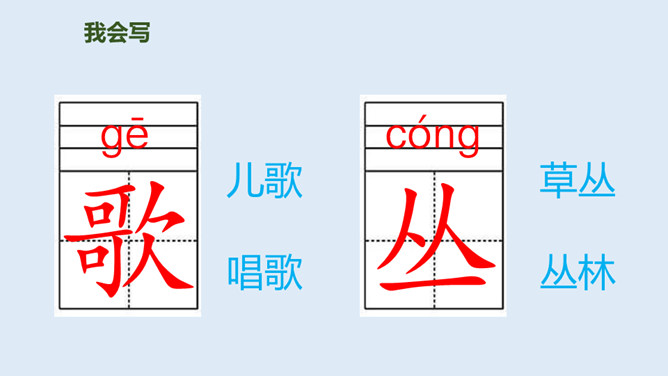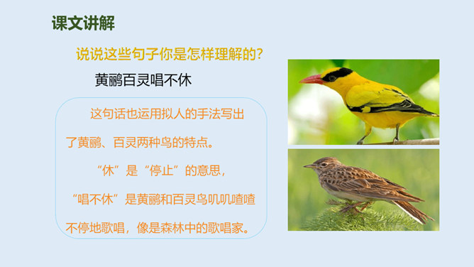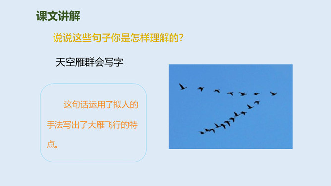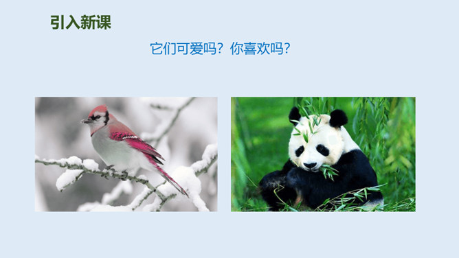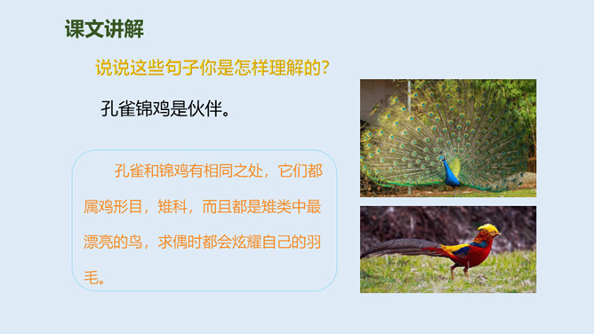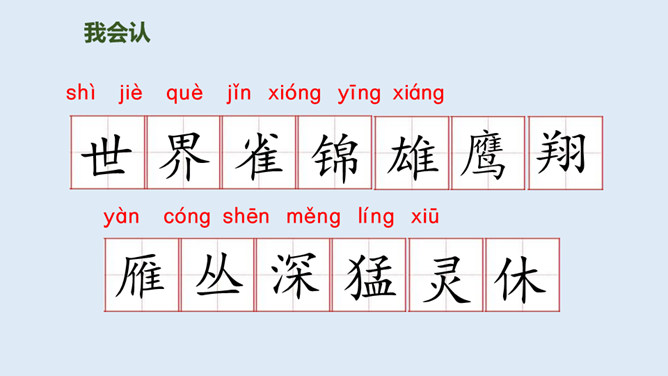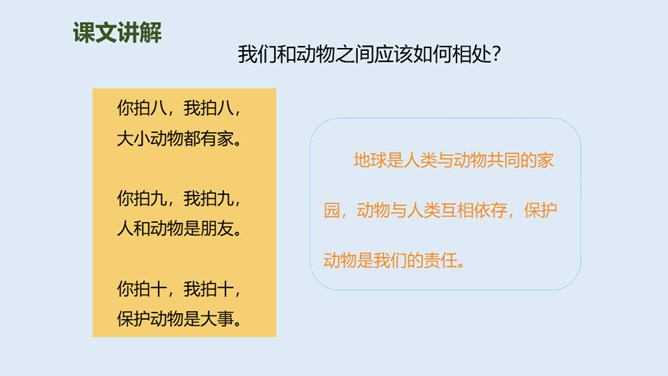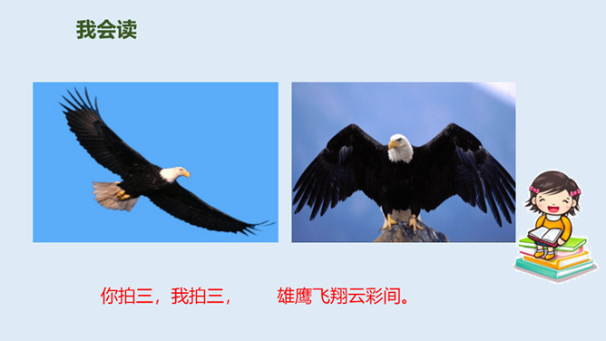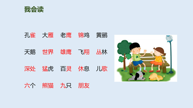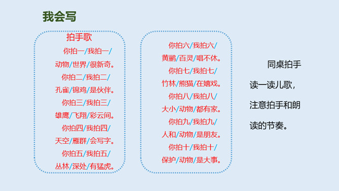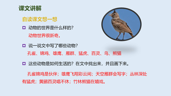 要求:读准字音、读通句子。思考:课文写了什么?本文以拍手歌的形式,给我们描绘了一幅动物在自然界里生存的美好画面。动物的世界是什么样的?动物世界很新奇。说一说文中写了哪些动物?孔雀、锦鸡、雄鹰、雁群、猛虎、百灵、鸟、熊猫。这些动物是如何生活的?在文中找出来,并且画下来。孔雀锦鸡是伙伴;雄鹰飞翔彩云间;天空雁群会写字;丛林深处有猛虎;黄鹂百灵唱不休;竹林熊猫在嬉戏。所属专题:拍手歌ppt。