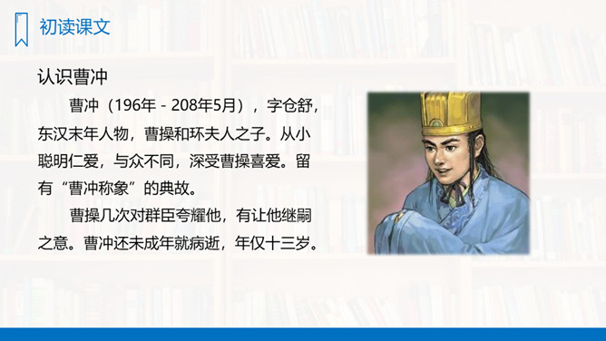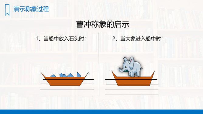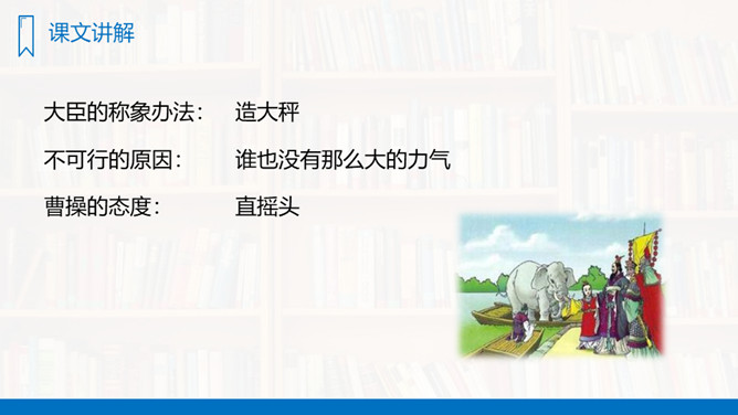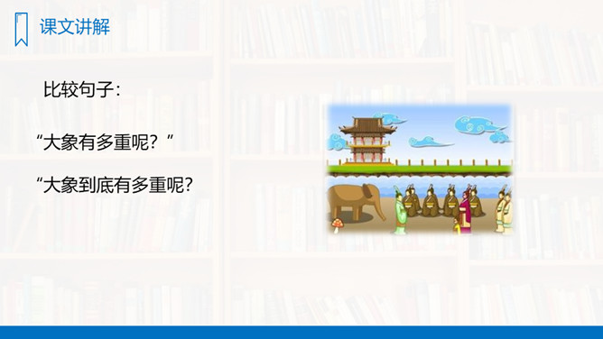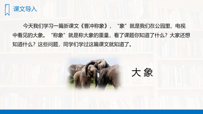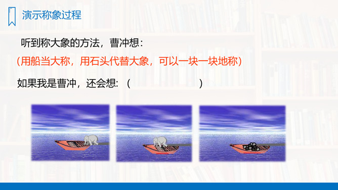 你们看见过秤吗?秤是干什么用的?今天我们学习一篇新课文,“象”就是我们在公园里、电视中看见的大象。“称象”就是称大象的重量,看了课题你知道了什么?大家还想知道什么?这些问题,同学们学过这篇课文就知道了。有感情地朗读课文,先标出课文有几个自然段,然后一边读,一边想,课文中讲了一件什么事?(1)曹冲的办法好吗?(2)如果现在让你们去称这头象的重量,你们有什么方法?所属专题:曹冲称象ppt。
