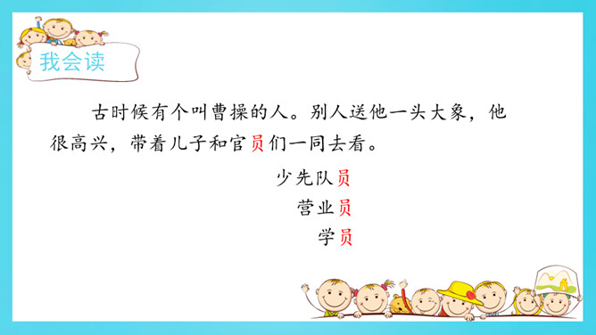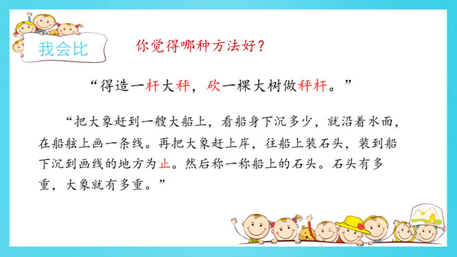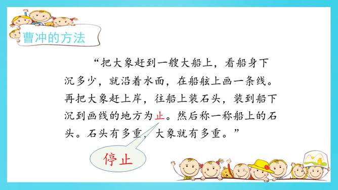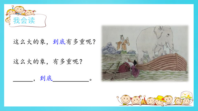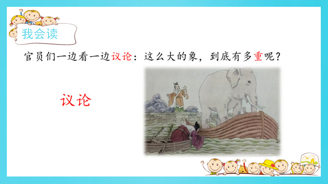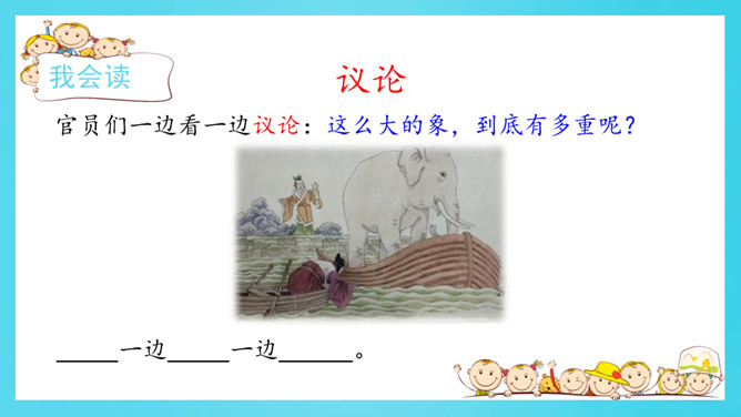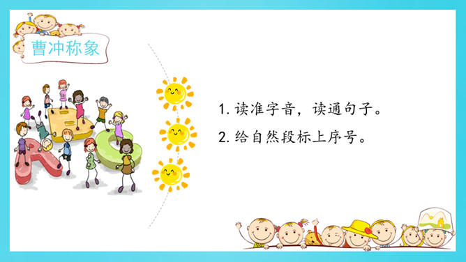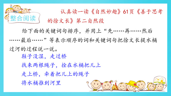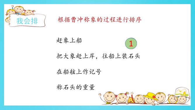 认真读一读《自然妙趣》61页《善于思考的徐文长》第二自然段。给下面的关键词句排序,并用上“先……再……然后……最后……”等表示顺序的词和关键词句把徐文长提水桶过河的过程说一说。借助这些关键词句,用上“先……再……然后……最后……”等表示顺序的词,说一说曹冲称象的过程。读准字音,读通句子。给自然段标上序号。所属专题:曹冲称象ppt。