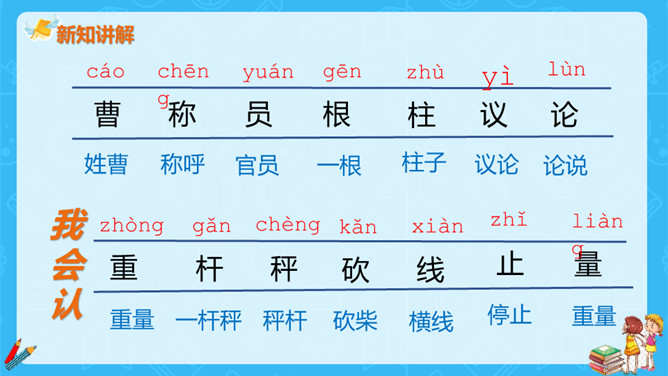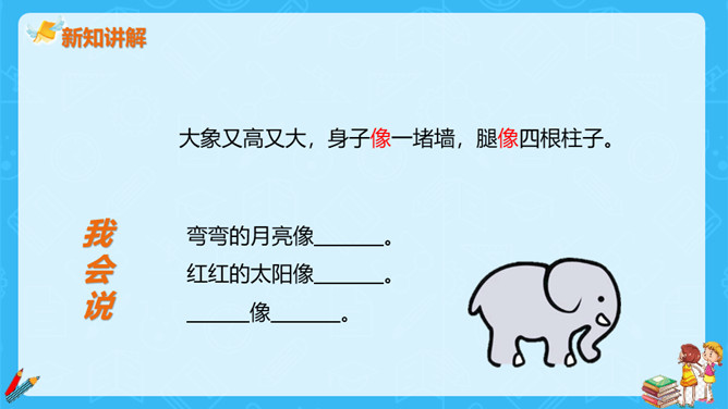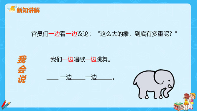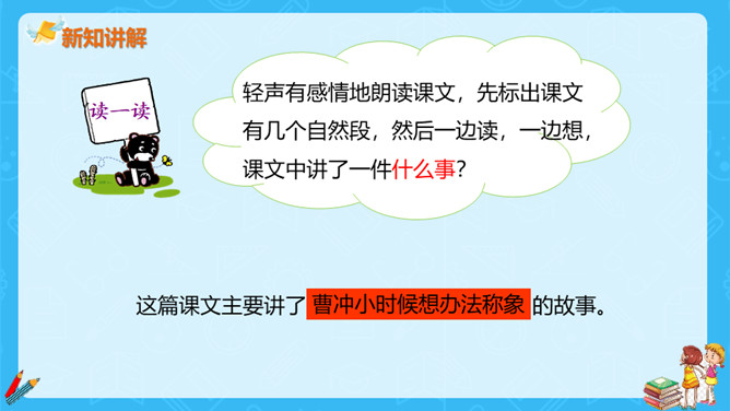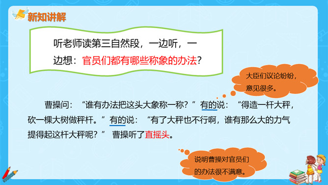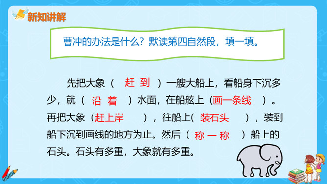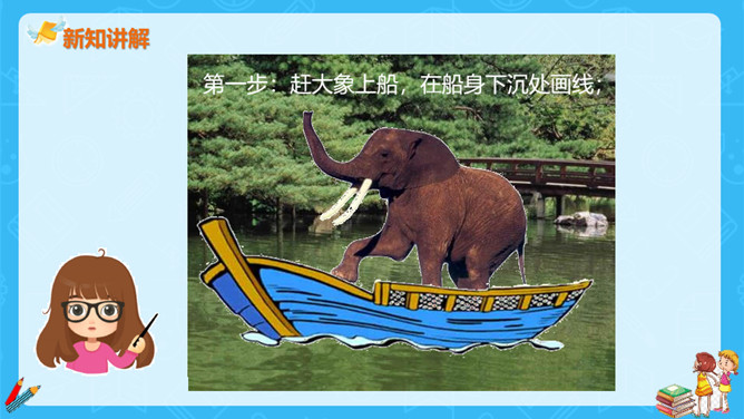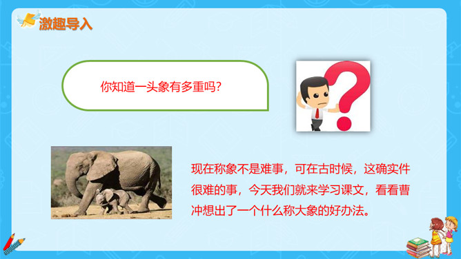 你知道一头象有多重吗?现在称象不是难事,可在古时候,这确实件很难的事,今天我们就来学习课文,看看曹冲想出了一个什么称大象的好办法。轻声有感情地朗读课文,先标出课文有几个自然段,然后一边读,一边想,课文中讲了一件什么事?听老师读第三自然段,一边听,一边想:官员们都有哪些称象的办法?曹冲的办法是什么?默读第四自然段,填一填。你认为曹冲的称象办法好吗?好在哪里?好,因为这个办法既能称出大象的重量,又不伤害大象。所属专题:曹冲称象ppt。