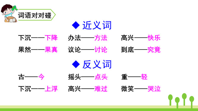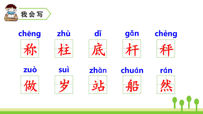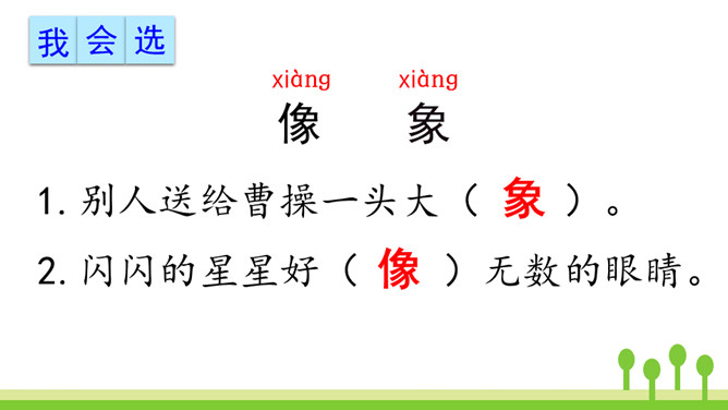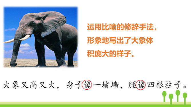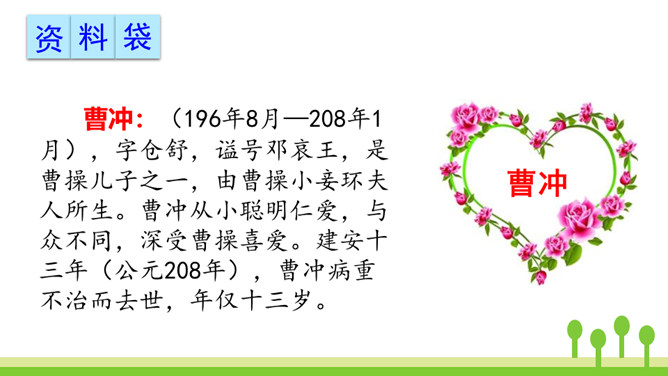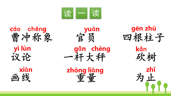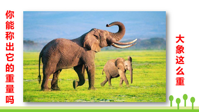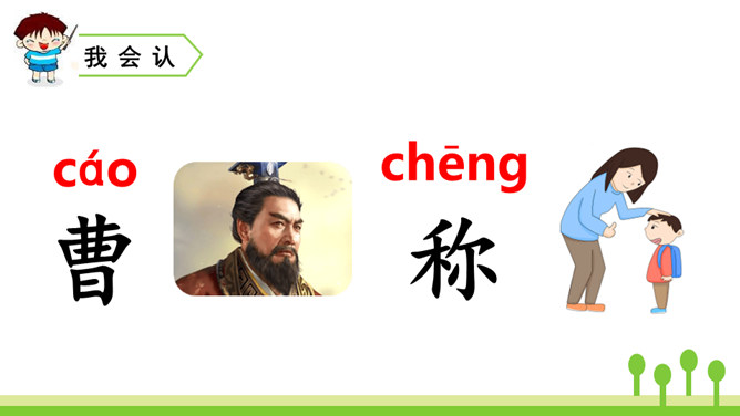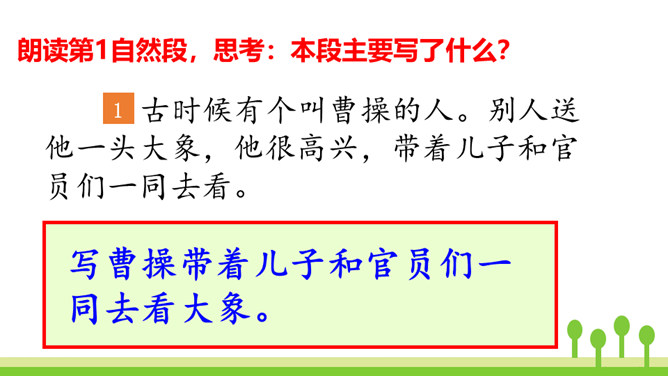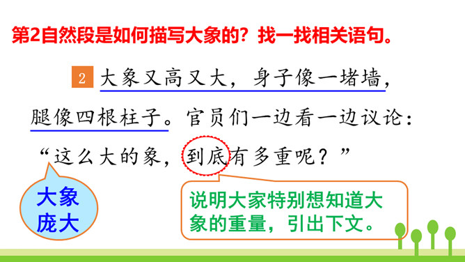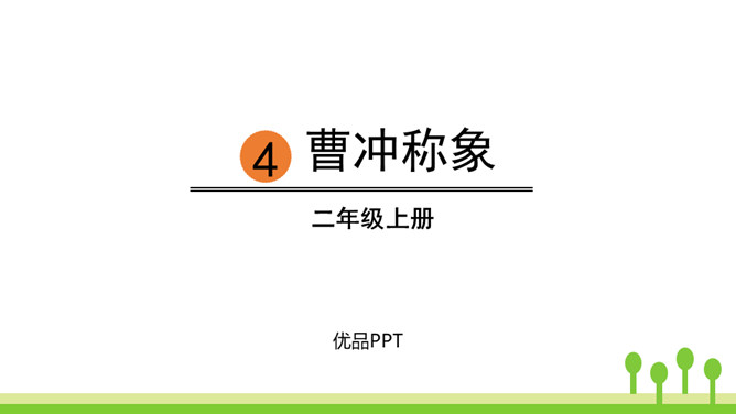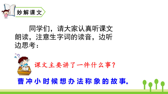 大象是庞然大物,在古代,要称出它的重量可真不容易!但是年仅七岁的曹冲却想出了一个好办法,称出了大象的重量。你知道他是怎么称的吗?我们一起走进课文,去了解一下吧!文中有两处描写了曹操对称象方法作出的不同反应,找出来读一读。曹操听了直摇头。“摇头”说明官员们的称象方法不好。曹操微笑着点了点头。“微笑、点头”说明曹操非常认同儿子的称象方法。对比鲜明,说明曹冲称象方法更好。所属专题:曹冲称象ppt。