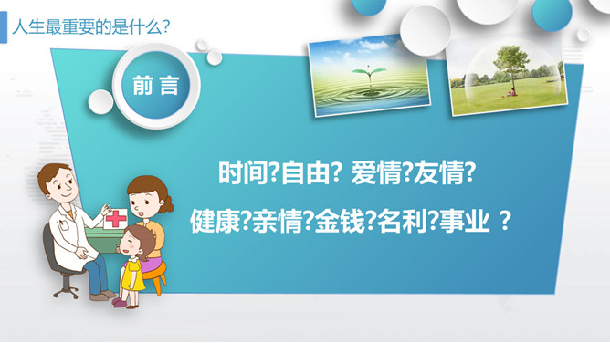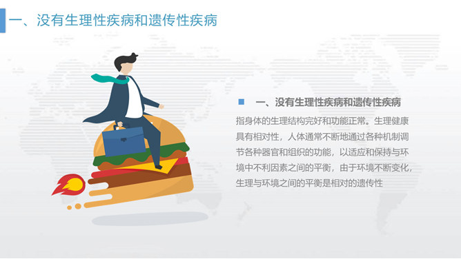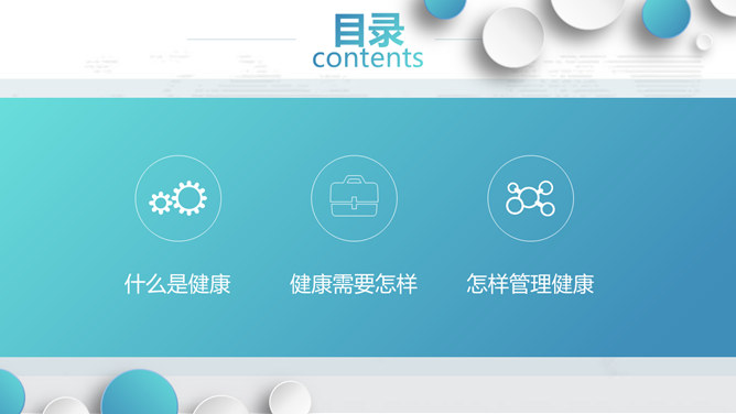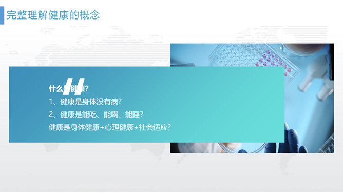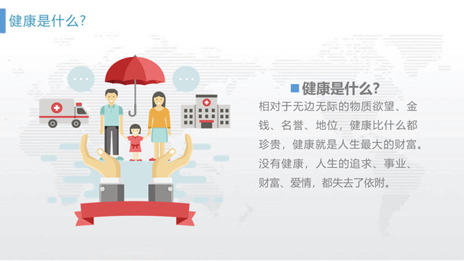 个人健康管理培训PPT模板。包括什么是健康、健康需要怎样、怎样管理健康三个部分。如果我们都能做到定期体检,就可以及早发现潜在的致病因素,达到早发现、早治疗的目的。但是……