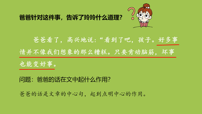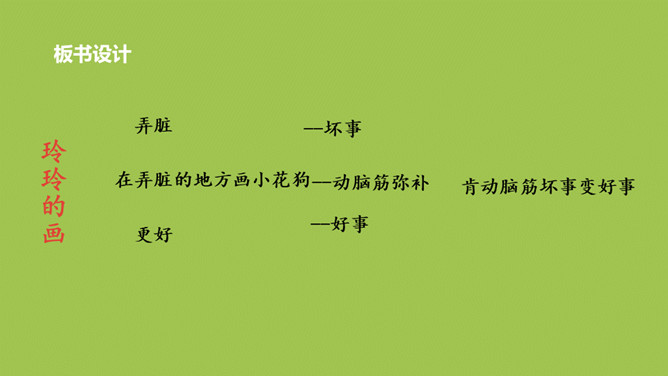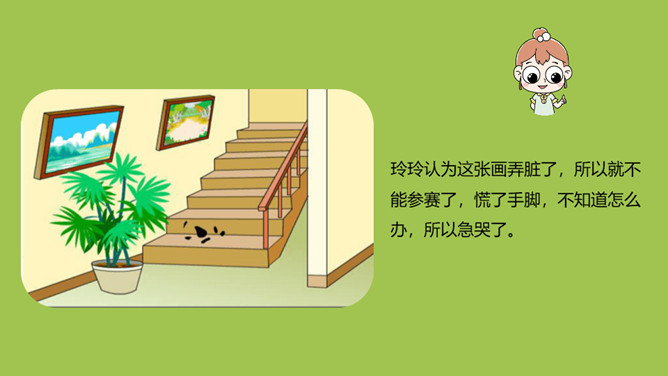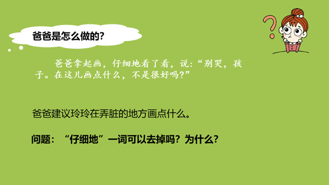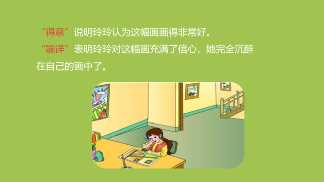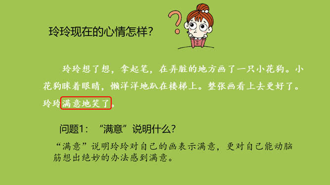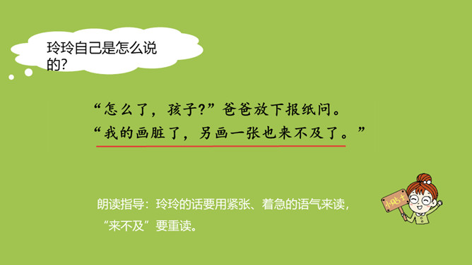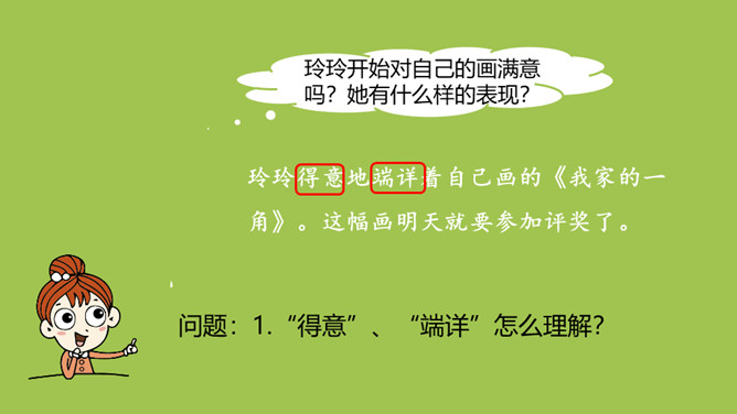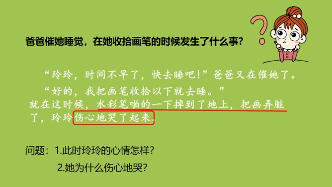 玲玲开始对自己的画满意吗?她有什么样的表现?问题:1.“得意”、“端详”怎么理解?“得意”说明玲玲认为这幅画画得非常好。“端详”表明玲玲对这幅画充满了信心,她完全沉醉在自己的画中了。爸爸催她睡觉,在她收拾画笔的时候发生了什么事?问题:1.此时玲玲的心情怎样?2.她为什么伤心地哭?玲玲自己是怎么说的?朗读指导:玲玲的话要用紧张、着急的语气来读,“来不及”要重读。所属专题:玲玲的画ppt。
