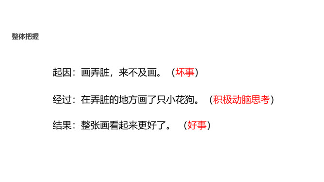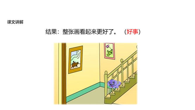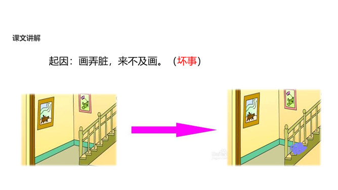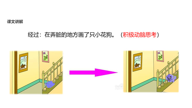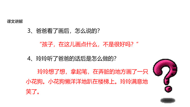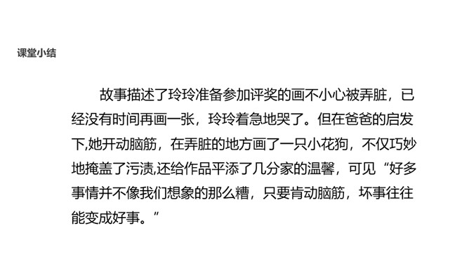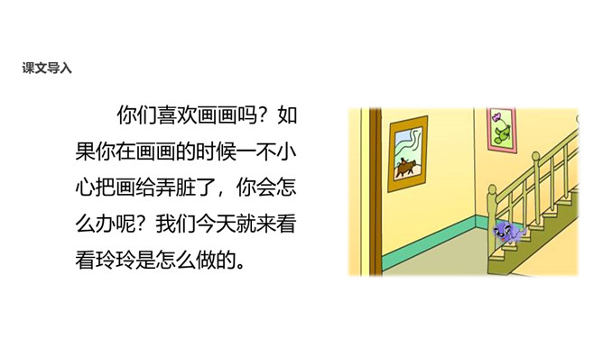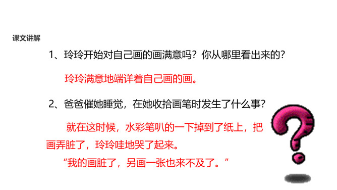你们喜欢画画吗?如果你在画画的时候一不小心把画给弄脏了,你会怎么办呢?我们今天就来看看玲玲是怎么做的。1、会认8个生字,会写9个生字;2、正确、流利、有感情地朗读课文,感悟积累对自己有启发的句子;3、懂得生活中只要肯动脑筋,坏事也能变成好事。1、玲玲开始对自己画的画满意吗?你从哪里看出来的?2、爸爸催她睡觉,在她收拾画笔时发生了什么事?3、爸爸看了画后,怎么说的?4、玲玲听了爸爸的话后是怎么做的?所属专题:玲玲的画ppt。