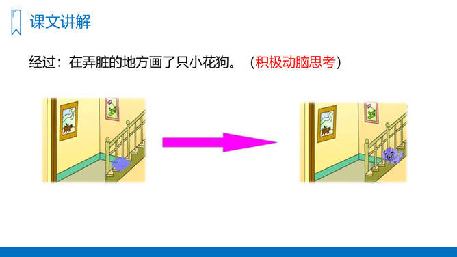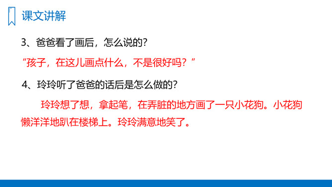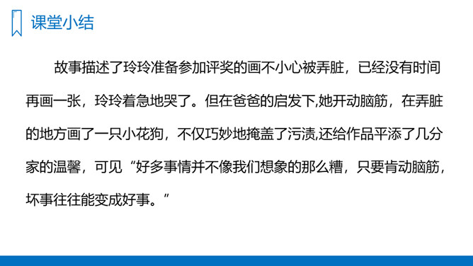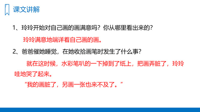 你们喜欢画画吗?如果你在画画的时候一不小心把画给弄脏了,你会怎么办呢?我们今天就来看看玲玲是怎么做的。你能用用自己的话,说出对文章主要内容的理解和感受吗?试试弄清故事的起因、经过和结果,理清文章顺序。爸爸的话有道理吗?听了爸爸的话,你有什么想法?你从爸爸与玲玲的对话中体会到了什么?1、复习生字词,熟读课文。2、在你们的生活和学习中,你遇到过这样的事吗?你是怎么办的呢?写一写。所属专题:玲玲的画ppt。
