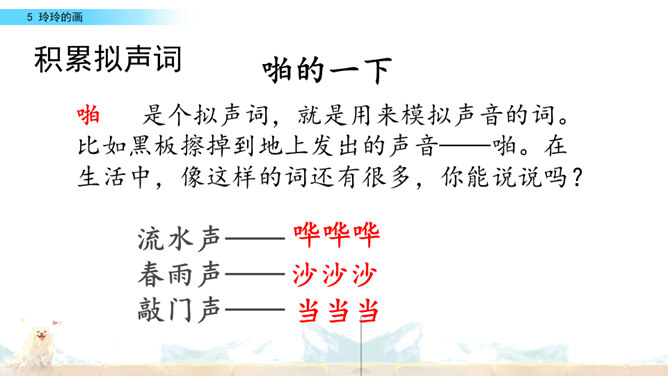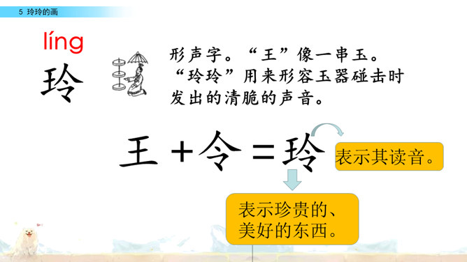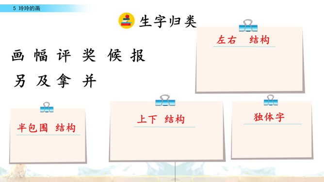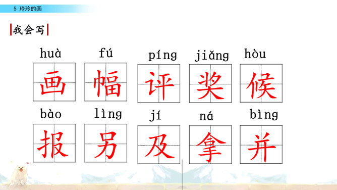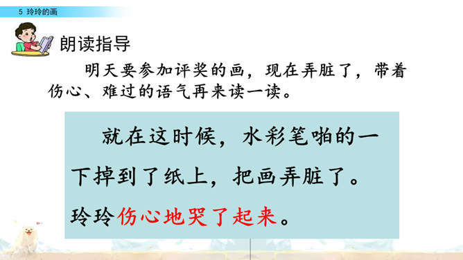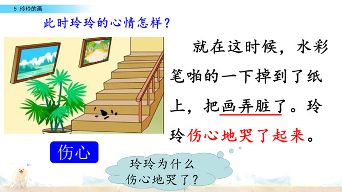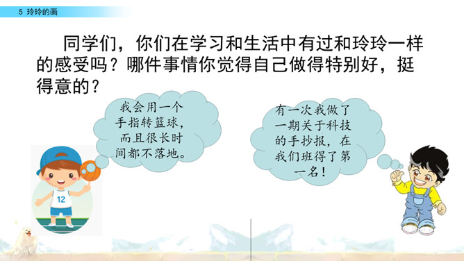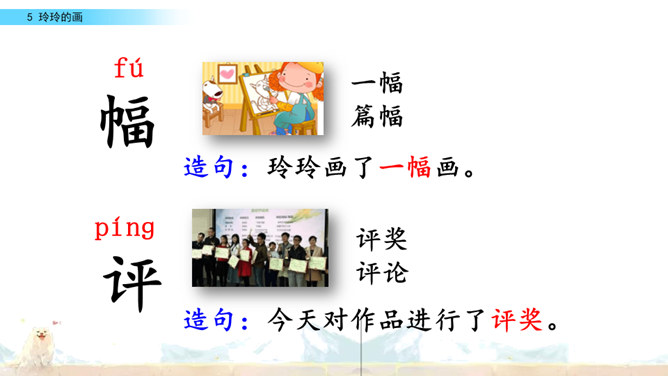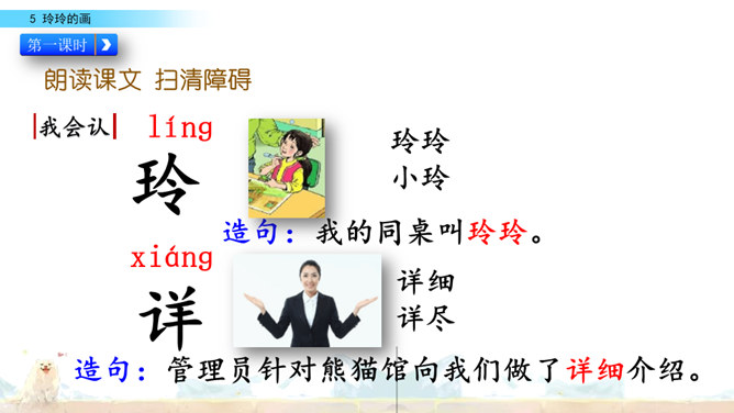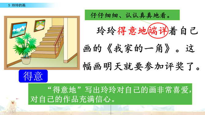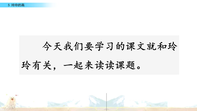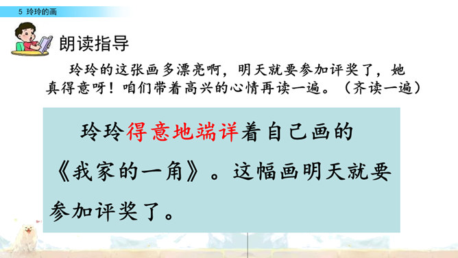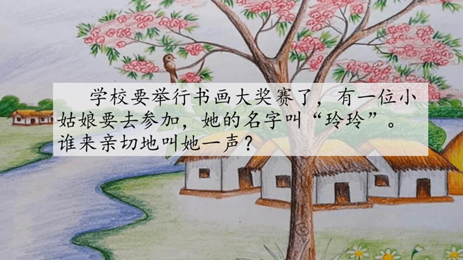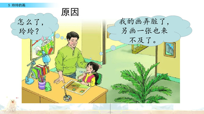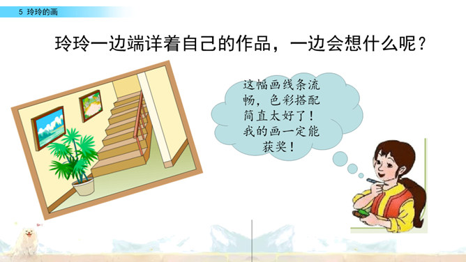 标出自然段序号。要是把下面这三幅画当做是课文插图,应该谁在前谁在后呢?读读课文想一想。上节课认识了两位新朋友,就是玲玲,还有她的爸爸。围绕玲玲画的一幅画,在他们之间发生了一件有意思的事。我们一起去看看吧!自由读课文,谁能借助提示说一说,围绕玲玲的画发生了一件什么事?玲玲画的是什么?看着自己的画,玲玲的心情怎样?你从哪里知道的?指名读第一自然段。玲玲一边端详着自己的作品,一边会想什么呢?所属专题:玲玲的画ppt。