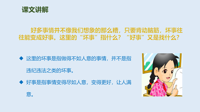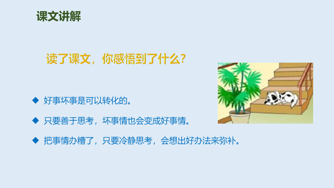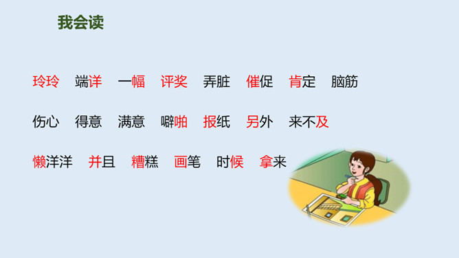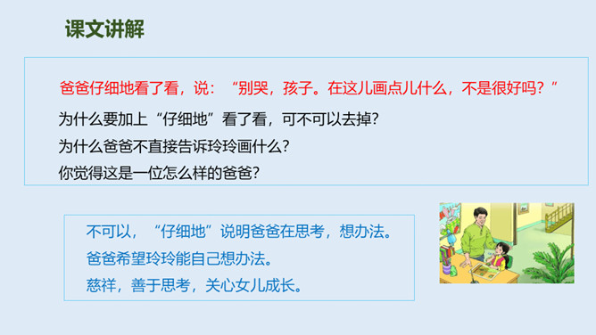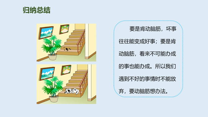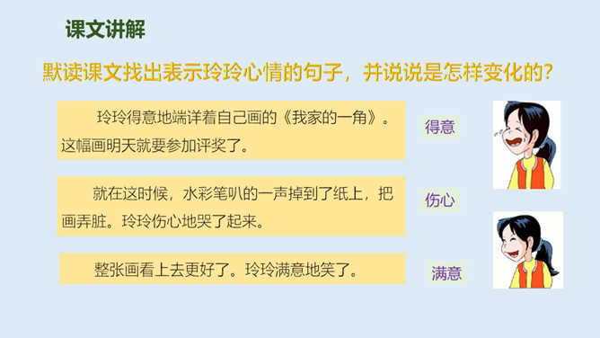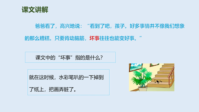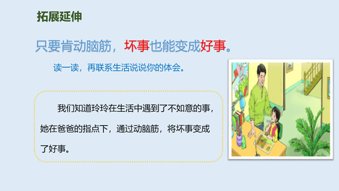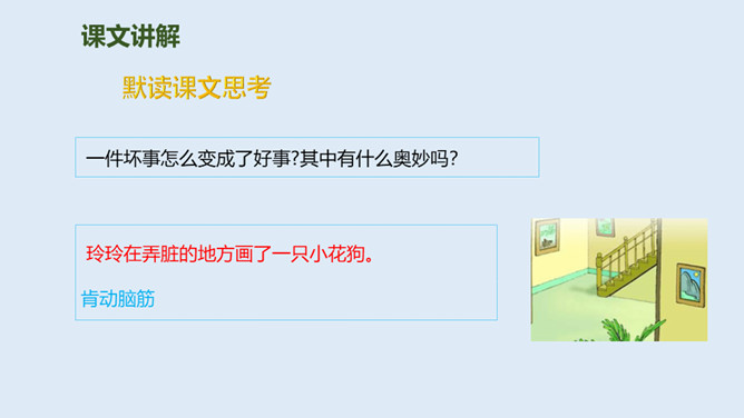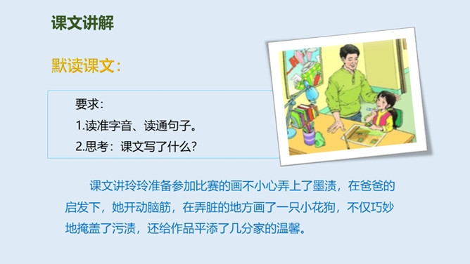 要求:1.读准字音、读通句子。2.思考:课文写了什么?课文讲玲玲准备参加比赛的画不小心弄上了墨渍,在爸爸的启发下,她开动脑筋,在弄脏的地方画了一只小花狗,不仅巧妙地掩盖了污渍,还给作品平添了几分家的温馨。读了课文,你感悟到了什么?好事坏事是可以转化的。只要善于思考,坏事情也会变成好事情。把事情办糟了,只要冷静思考,会想出好办法来弥补。要是肯动脑筋,坏事往往能变成好事;要是肯动脑筋,看来不可能办成的事也能办成。所以我们遇到不好的事情时不能放弃,要动脑筋想办法。所属专题:玲玲的画ppt。