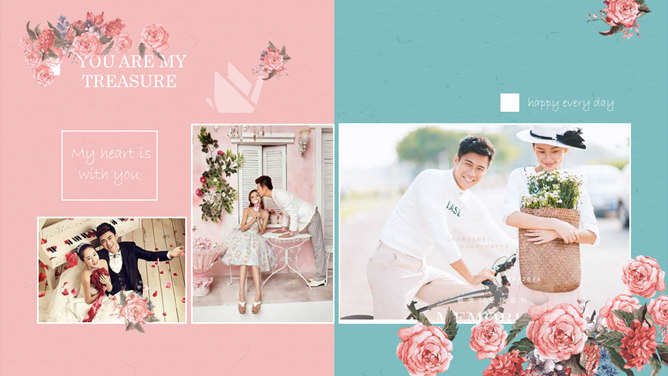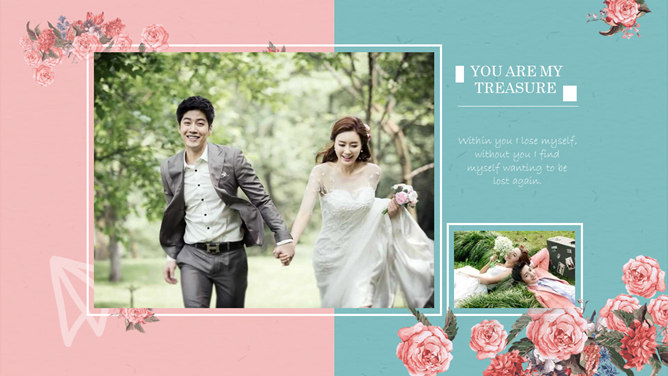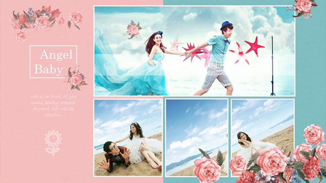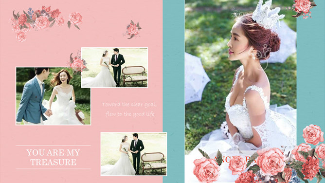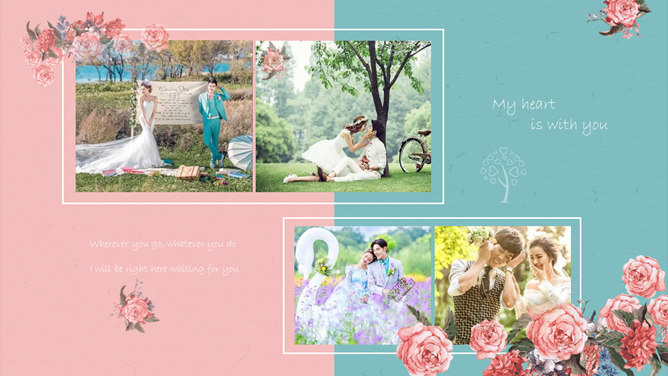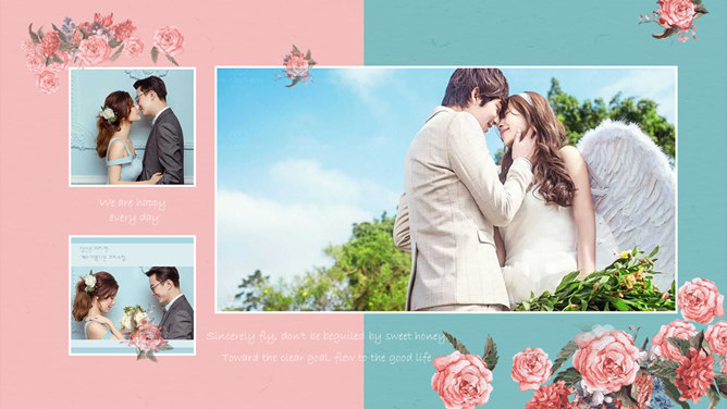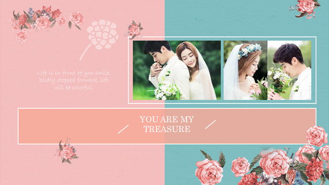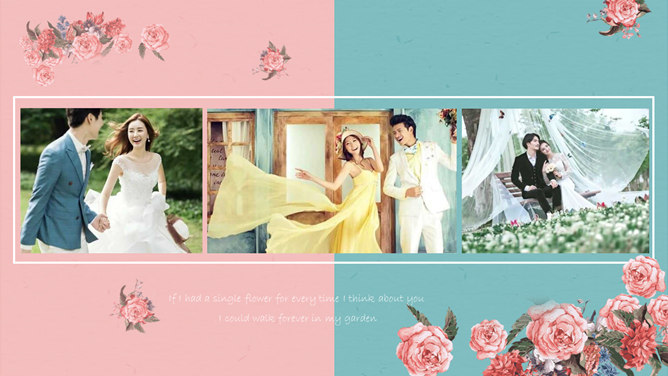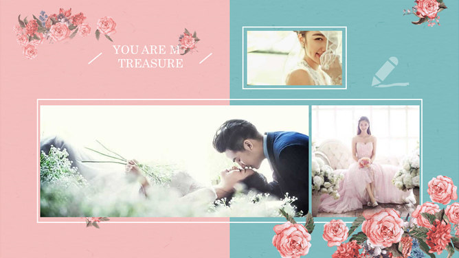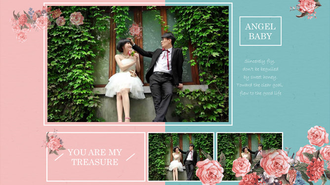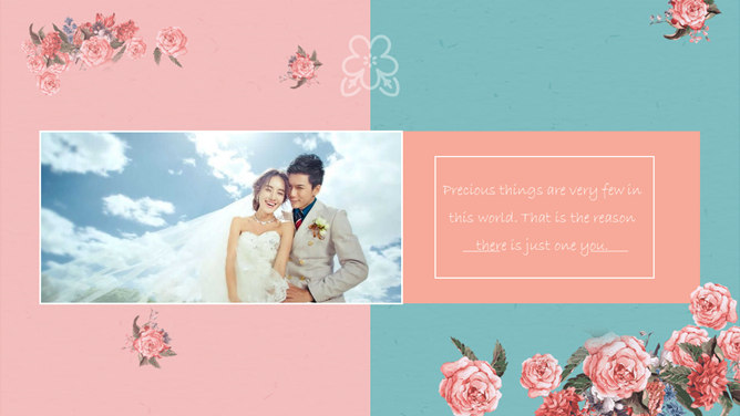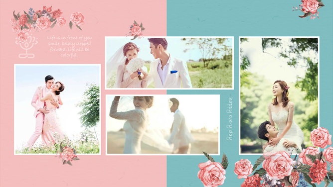 玫瑰花结婚婚礼相册PPT模板。一套婚礼庆典婚纱照相册幻灯片模板,清新粉蓝配色,多种图片照片排版,玫瑰花装饰。