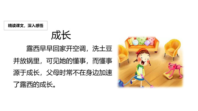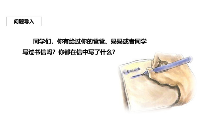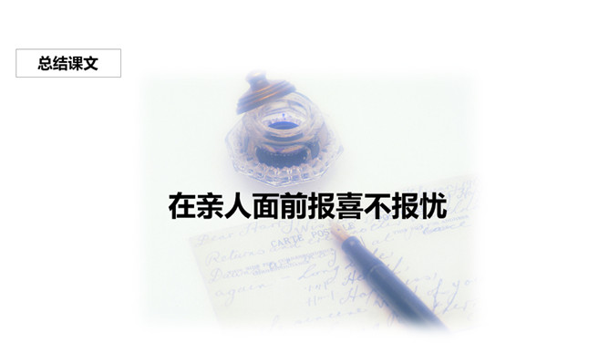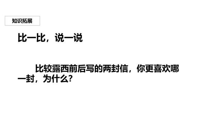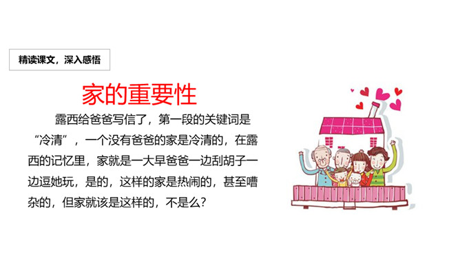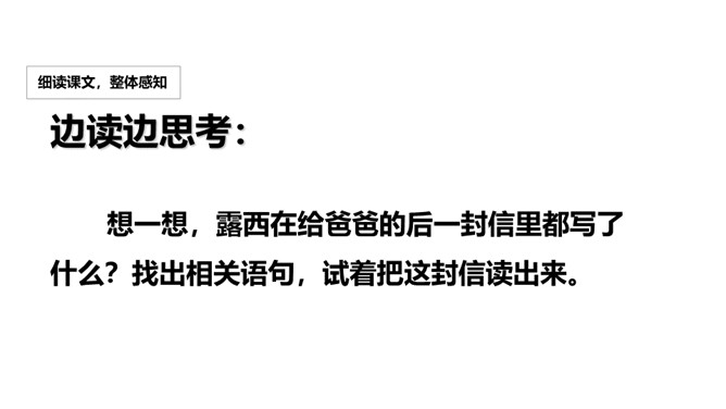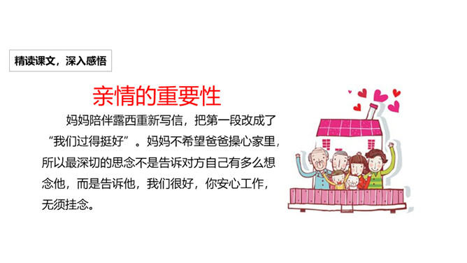 1、把这篇课文的内容讲给父母听;2、在生活中你遇到类似的问题?你是怎样处理的?露西给爸爸写信了,第一段的关键词是“冷清”,一个没有爸爸的家是冷清的,在露西的记忆里,家就是一大早爸爸一边刮胡子一边逗她玩,是的,这样的家是热闹的,甚至嘈杂的,但家就该是这样的,不是么?妈妈陪伴露西重新写信,把第一段改成了“我们过得挺好”。妈妈不希望爸爸操心家里,所以最深切的思念不是告诉对方自己有多么想念他,而是告诉他,我们很好,你安心工作,无须挂念。所属专题:一封信ppt。