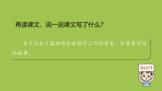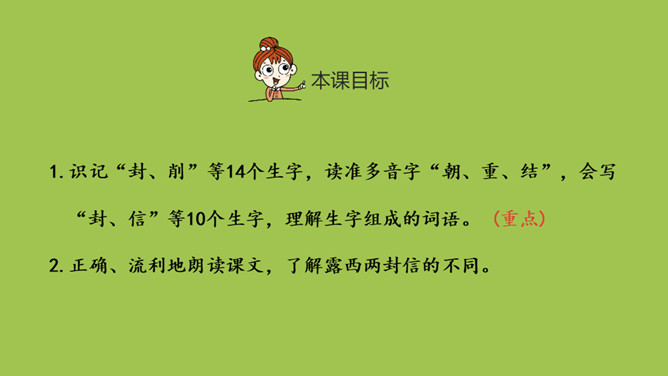 1.识记“封、削”等14个生字,读准多音字“朝、重、结”,会写“封、信”等10个生字,理解生字组成的词语。 (重点)2.正确、流利地朗读课文,了解露西两封信的不同。请同学们看一下图上这是什么?再读课文,说一说课文写了什么?本文记叙了露西想念在国外工作的爸爸,给爸爸写信的故事。给画线字选择正确的读音,然后打对勾。所属专题:一封信ppt。