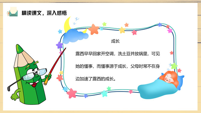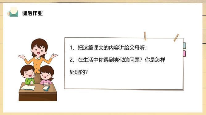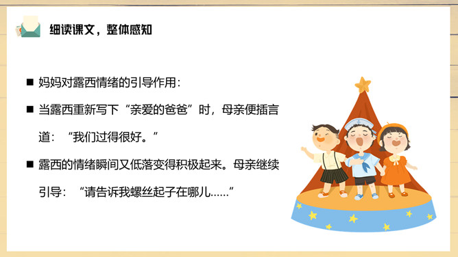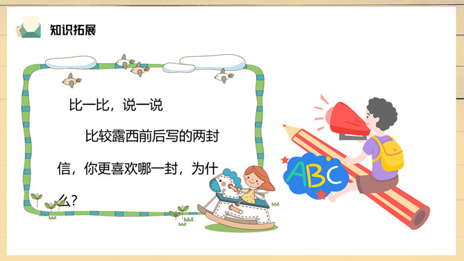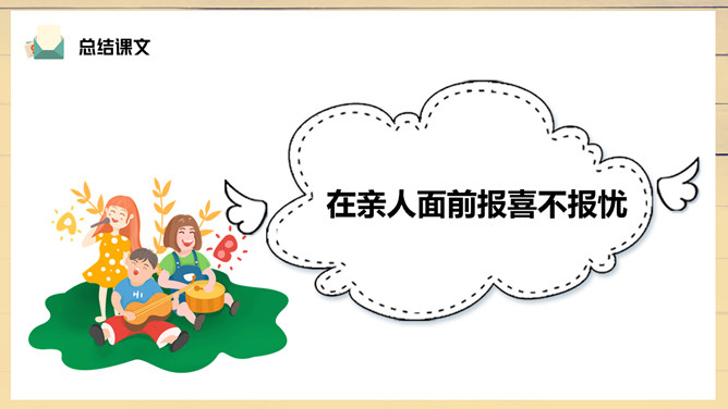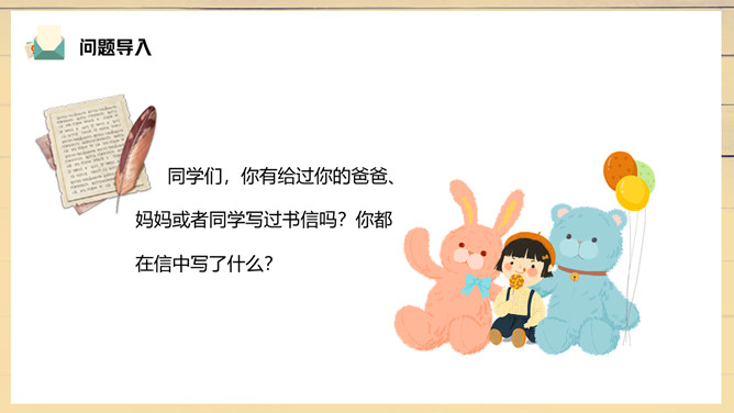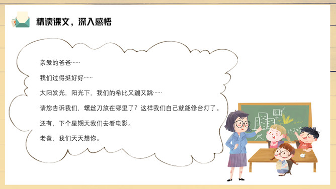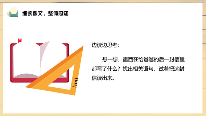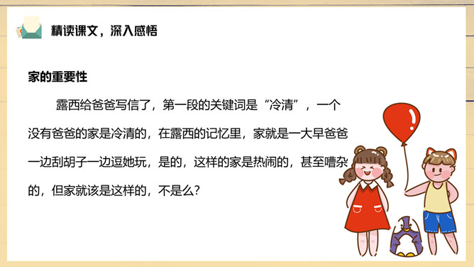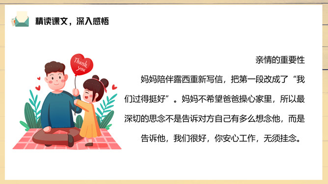 妈妈陪伴露西重新写信,把第一段改成了“我们过得挺好”。妈妈不希望爸爸操心家里,所以最深切的思念不是告诉对方自己有多么想念他,而是告诉他,我们很好,你安心工作,无须挂念。1、把这篇课文的内容讲给父母听;2、在生活中你遇到类似的问题?你是怎样处理的?露西早早回家开空调,洗土豆并放锅里,可见她的懂事,而懂事源于成长,父母时常不在身边加速了露西的成长。所属专题:一封信ppt。