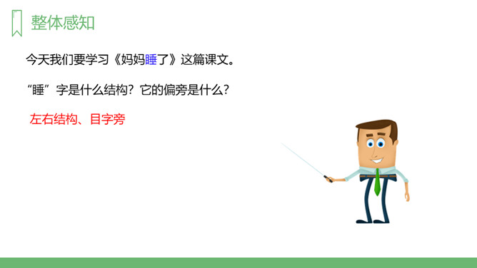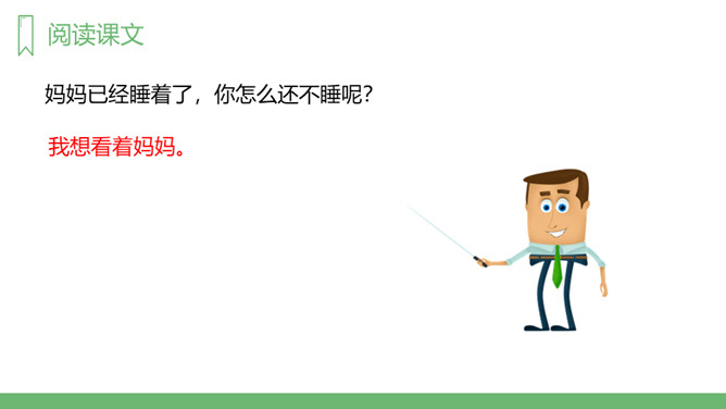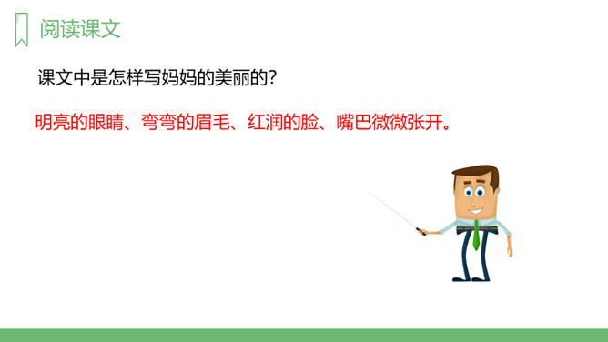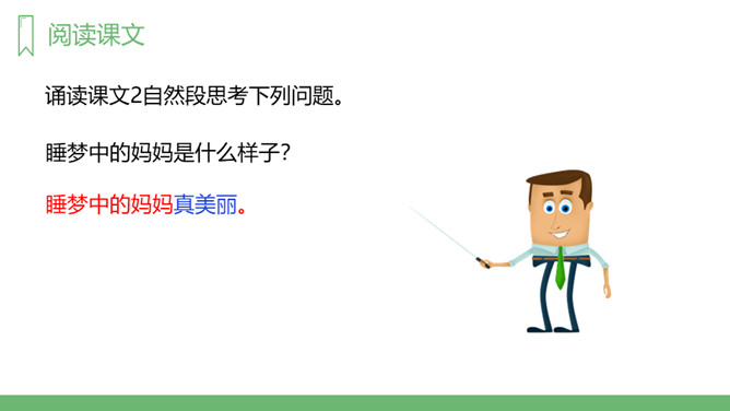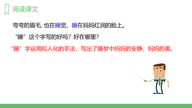 诵读课文1自然段思考下列问题。妈妈睡得多香啊!可是妈妈不是在哄我睡午觉吗?怎么自己先睡着了呢?课文中是怎样写妈妈的美丽的?明亮的眼睛、弯弯的眉毛、红润的脸、嘴巴微微张开。“睡”这个字写的好吗?好在哪里?“睡”字运用拟人化的手法,写出了睡梦中妈妈的安静,妈妈的美。“温柔”是什么意思呢?温柔:温和柔顺,多用来指女性。哪里可以看出睡梦中的妈妈“温柔”?所属专题:妈妈睡了ppt。