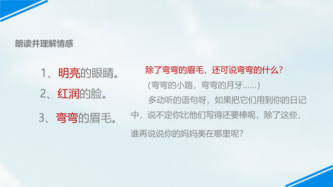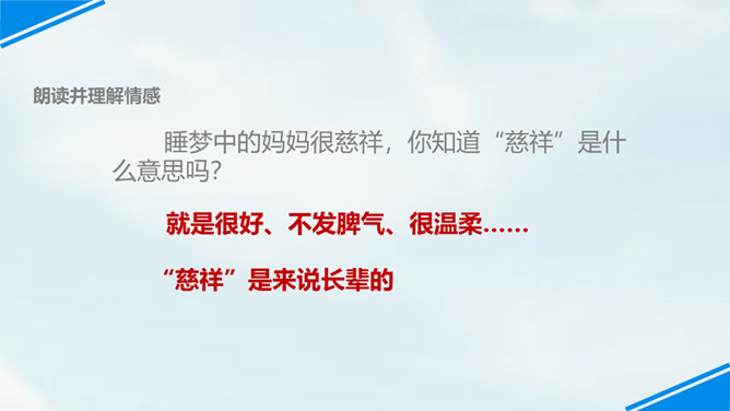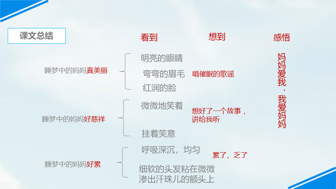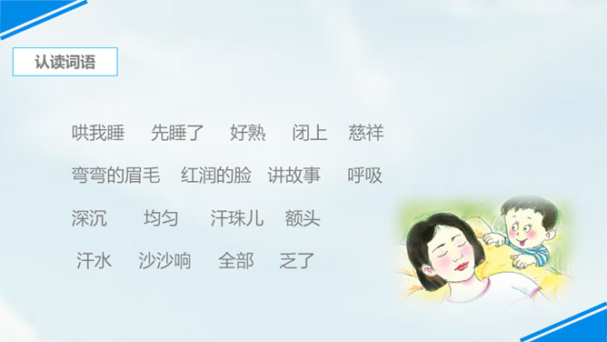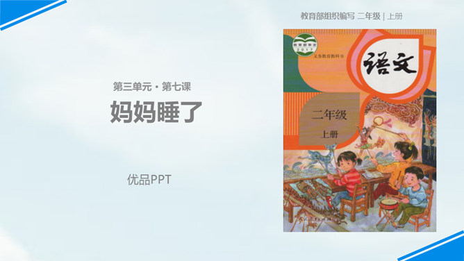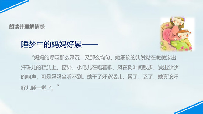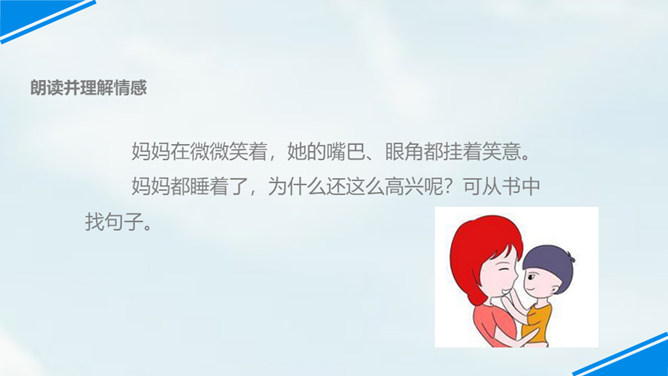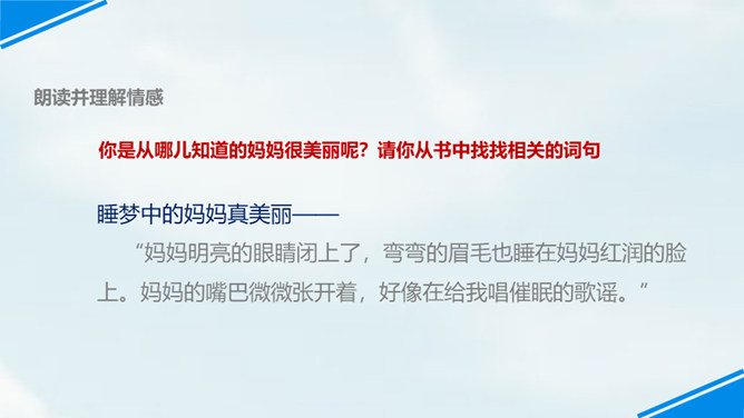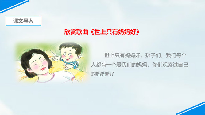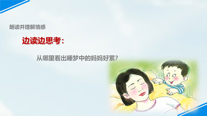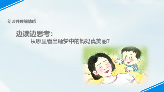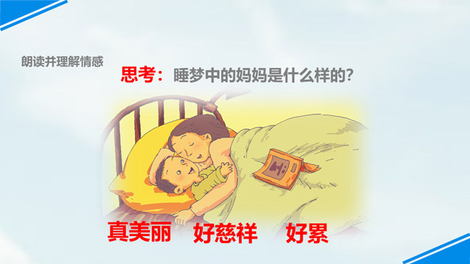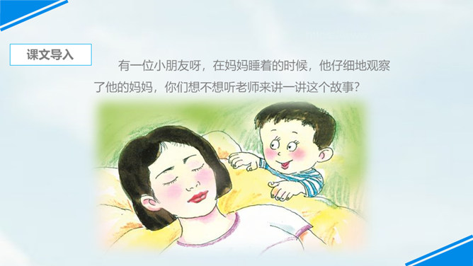 世上只有妈妈好,孩子们,我们每个人都有一个爱我们的妈妈,你们观察过自己的妈妈吗?有一位小朋友呀,在妈妈睡着的时候,他仔细地观察了他的妈妈,你们想不想听老师来讲一讲这个故事?边读边思考:从哪里看出睡梦中的妈妈真美丽?你是从哪儿知道的妈妈很美丽呢?请你从书中找找相关的词句。睡梦中的妈妈很慈祥,你知道“慈祥”是什么意思吗?妈妈都睡着了,为什么还这么高兴呢?可从书中找句子。所属专题:妈妈睡了ppt。
