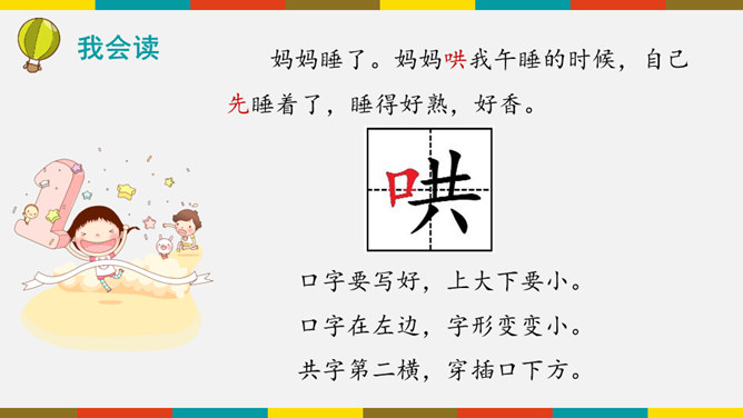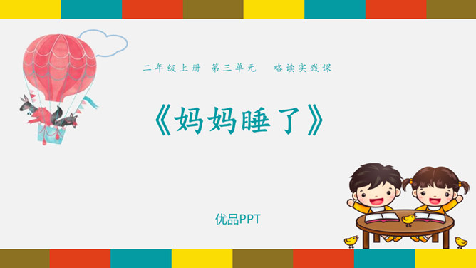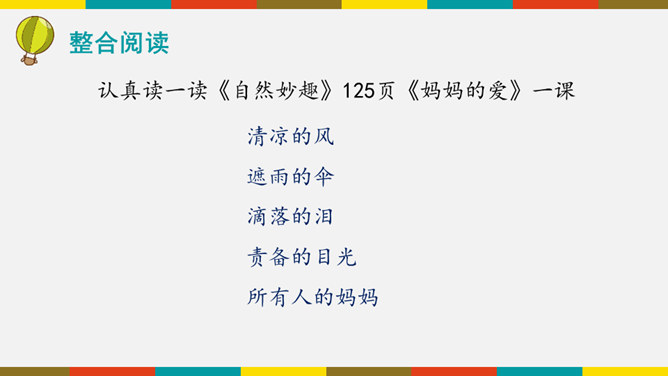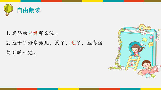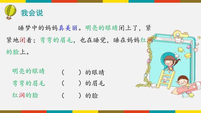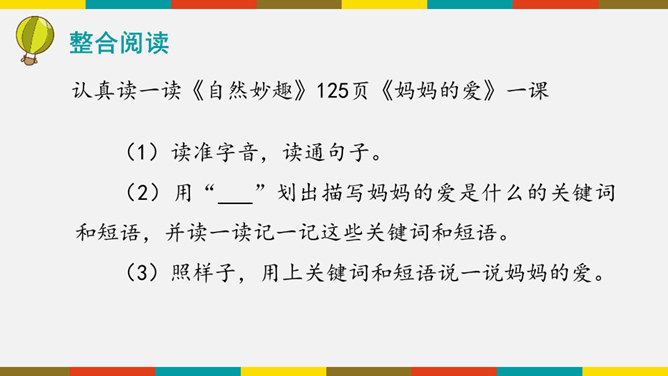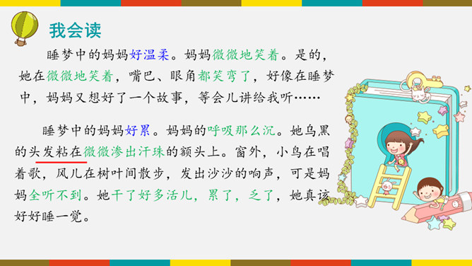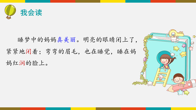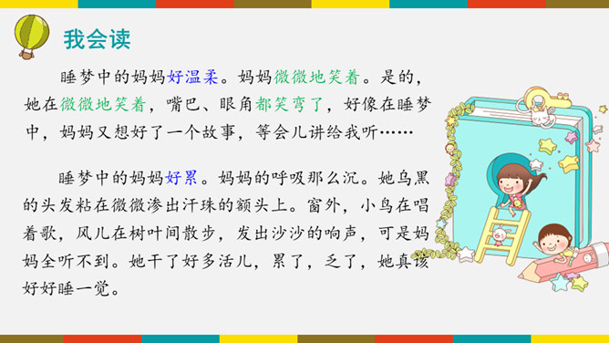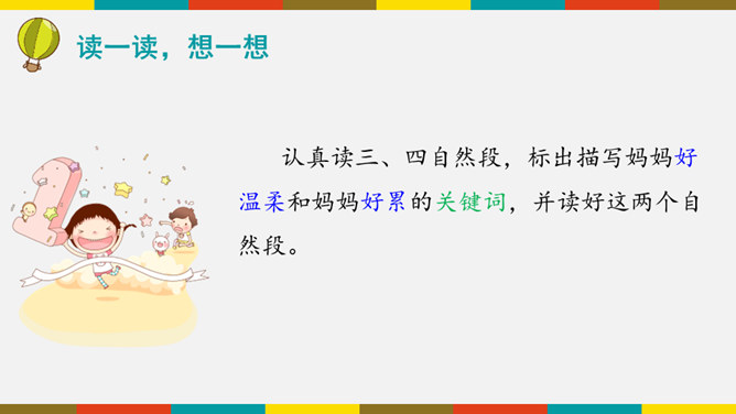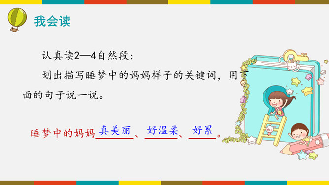 1.读准字音,读通句子,遇到难读的字多读几遍。 2.给自然段标上序号。认真读2—4自然段:划出描写睡梦中的妈妈样子的关键词,用下面的句子说一说。认真读三、四自然段,标出描写妈妈好温柔和妈妈好累的关键词,并读好这两个自然段。(1)读准字音,读通句子。(2)用“ ”划出描写妈妈的爱是什么的关键词和短语,并读一读记一记这些关键词和短语。(3)照样子,用上关键词和短语说一说妈妈的爱。所属专题:妈妈睡了ppt。