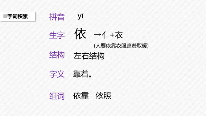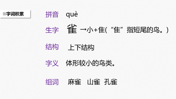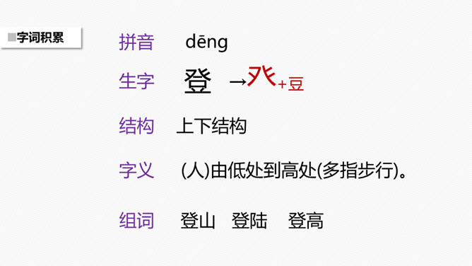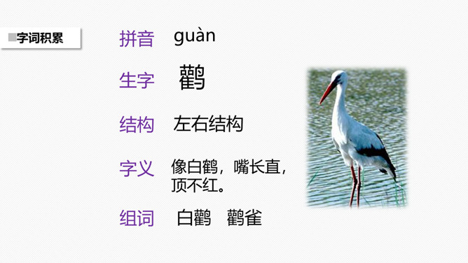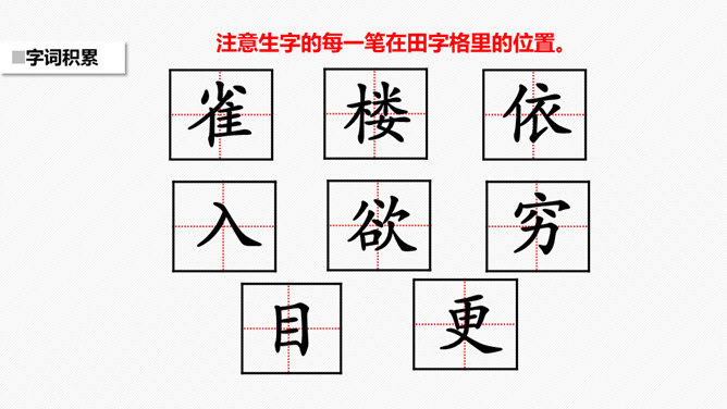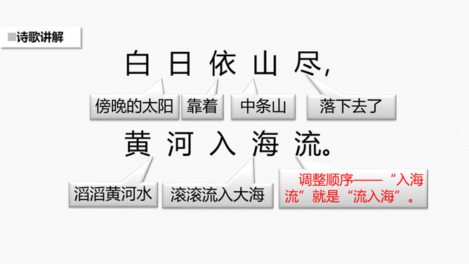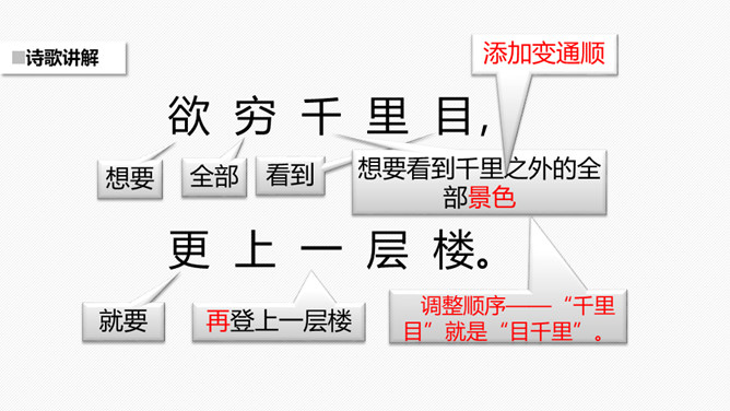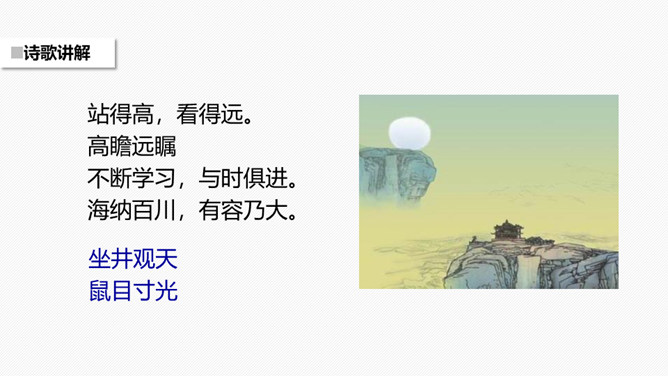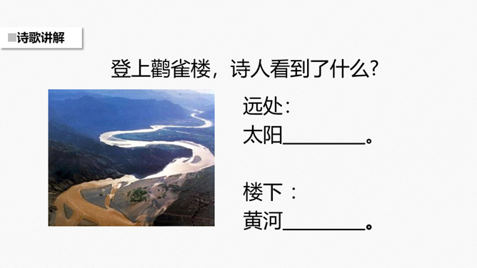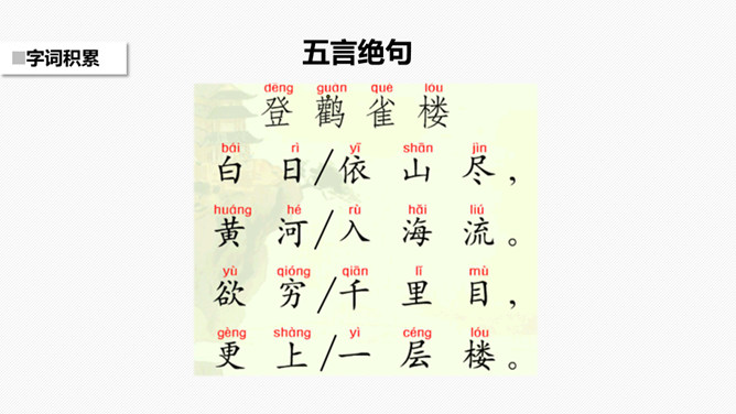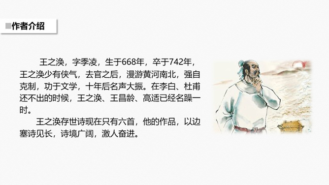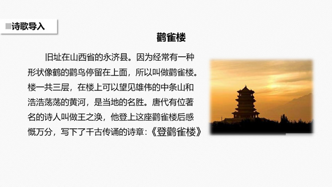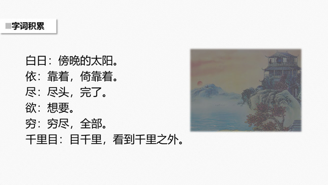 白日:傍晚的太阳。依:靠着,倚靠着。尽:尽头,完了。欲:想要。穷:穷尽,全部。千里目:目千里,看到千里之外。王之涣存世诗现在只有六首,他的作品,以边塞诗见长,诗境广阔,激人奋进。因为经常有一种形状像鹤的鹳鸟停留在上面,所以叫做鹳雀楼。楼一共三层,在楼上可以望见雄伟的中条山和浩浩荡荡的黄河,是当地的名胜。旧址在山西省的永济县。所属专题:登鹳雀楼ppt。