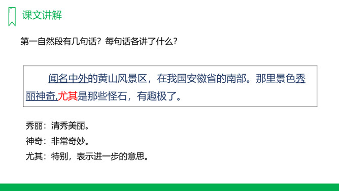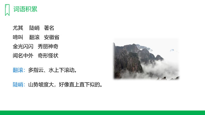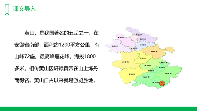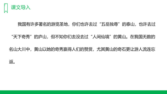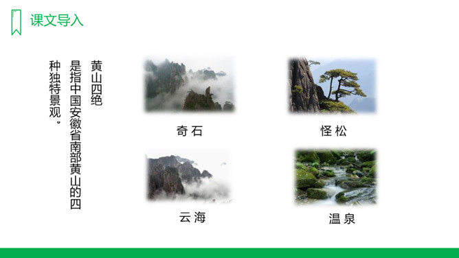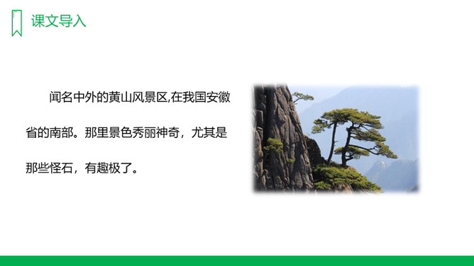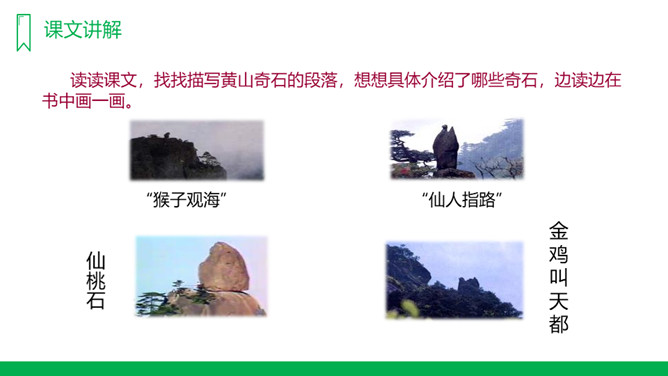 1、课文中没有详细介绍“天狗望月”“狮子抢球”和“仙女弹琴”等奇石,请仿照课文的写法,充分发挥想象,选其中你喜欢的一块奇石,把它说具体。2、有能力的同学还可以模仿课文第二自然段的写法,任选两块奇石,把它们写成并列结构的段落。 通过今天的学习,同学们体会到了黄山石的奇妙,领略了黄山秀丽的景色。希望同学们长大后,能亲自去目睹黄山奇景,看一看那里的奇松、云海、温泉是一番什么景象。所属专题:黄山奇石ppt。