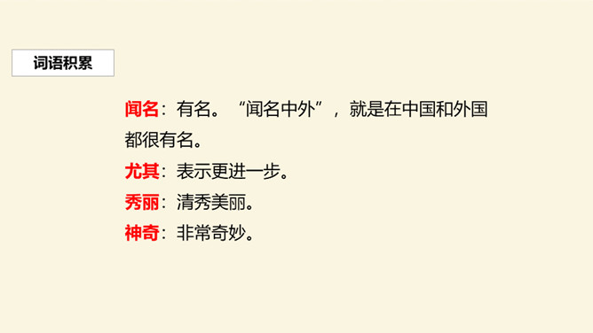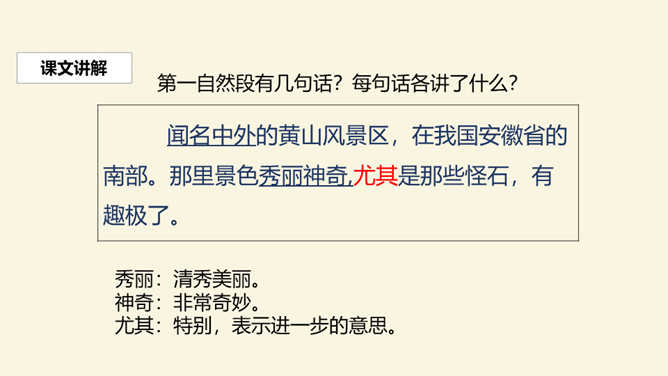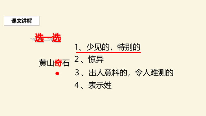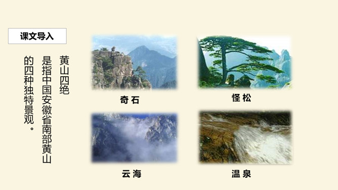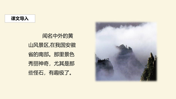 通过今天的学习,同学们体会到了黄山石的奇妙,领略了黄山秀丽的景色。希望同学们长大后,能亲自去目睹黄山奇景,看一看那里的奇松、云海、温泉是一番什么景象。1、课文中没有详细介绍“天狗望月”“狮子抢球”和“仙女弹琴”等奇石,请仿照课文的写法,充分发挥想象,选其中你喜欢的一块奇石,把它说具体。2、有能力的同学还可以模仿课文第二自然段的写法,任选两块奇石,把它们写成并列结构的段落。所属专题:黄山奇石ppt。