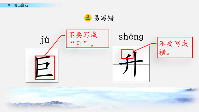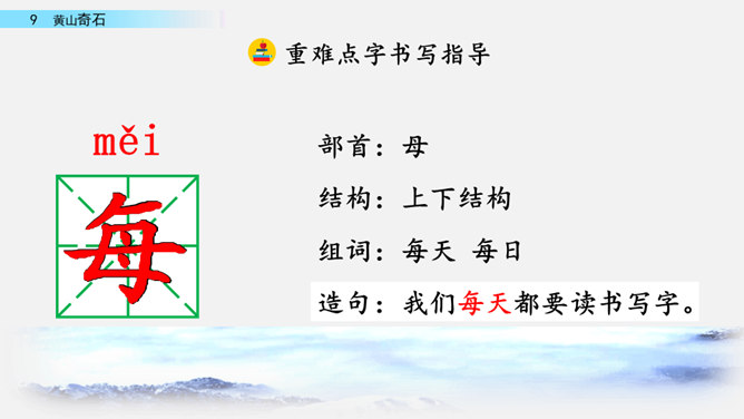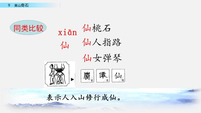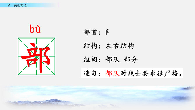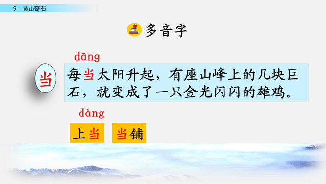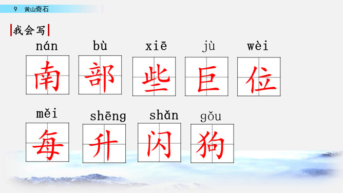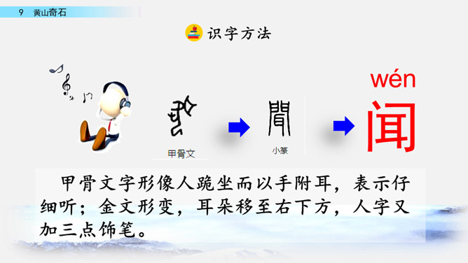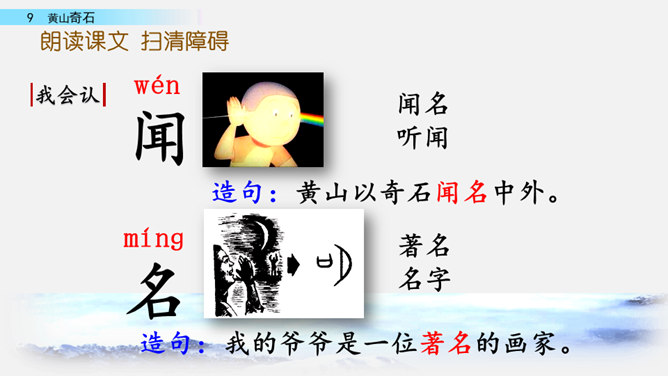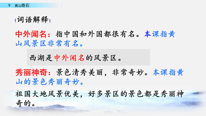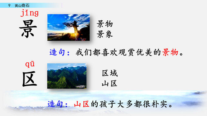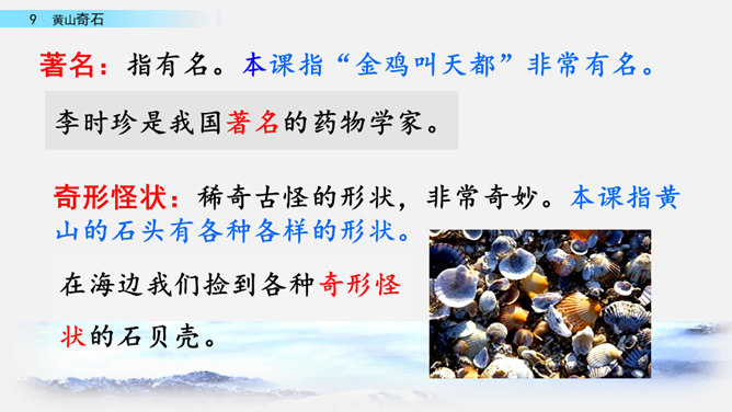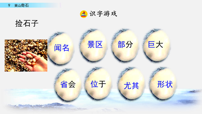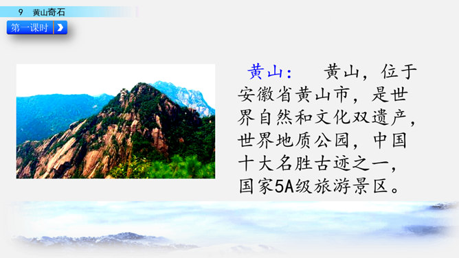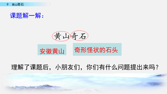 理解了课题后,小朋友们,你们有什么问题提出来吗?问题1:课文具体介绍了哪些奇石?问题2:哪些奇石课文只是简单举了名字?上节课我们初读了课文,对课文内容有了大致了解,并且学习了生字新词。这节课老师来当导游,带大家去欣赏那有趣的奇石,感受大自然的壮丽,好吗?听老师读第一自然段,同学们边听边思考:黄山风景区在哪里?那里的风景怎么样呢?自由朗读2-5自然段,边读边用笔圈画:这三段具体地介绍了哪几处怪石?它们分别有什么特点?所属专题:黄山奇石ppt。