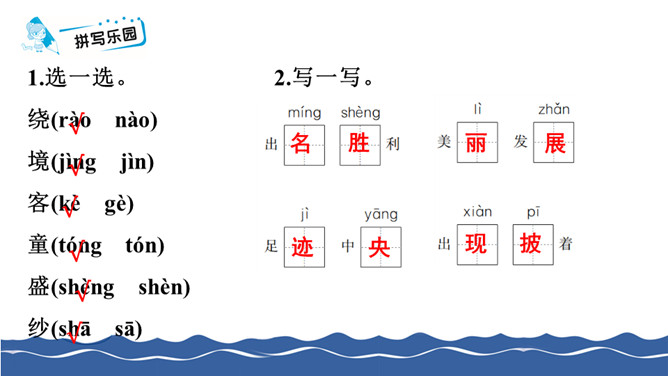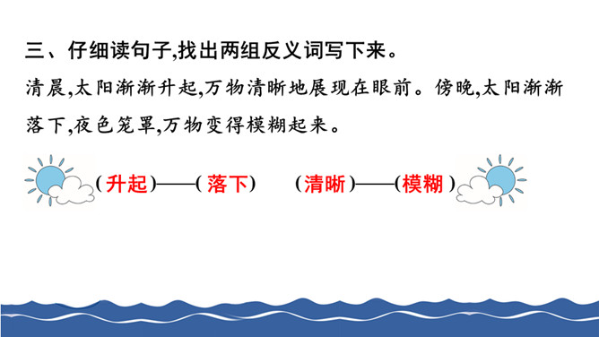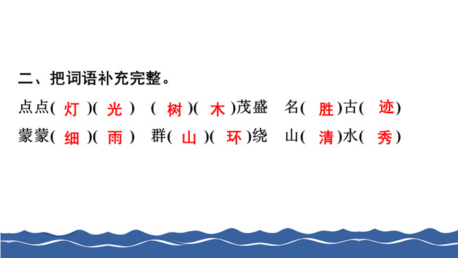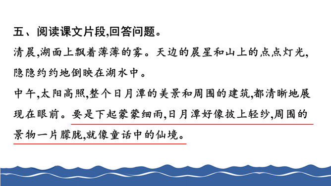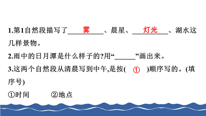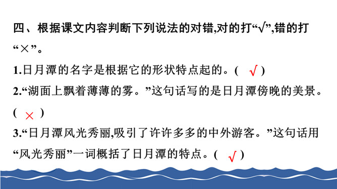 给下面带有正确读音的叶子涂上颜色。把词语补充完整。仔细读句子,找出两组反义词写下来。根据课文内容判断下列说法的对错,对的打“√”,错的打“×”。阅读课文片段,回答问题。第1自然段描写了雾、晨星、灯光、湖水这几样景物。 雨中的日月潭是什么样子的?用横线画出来。所属专题:日月潭ppt。