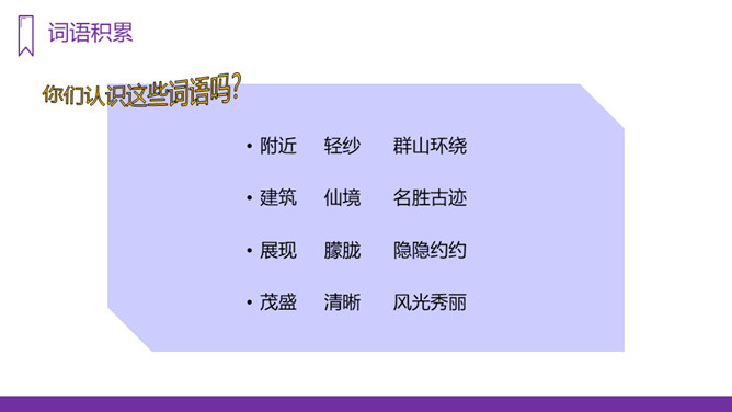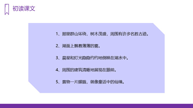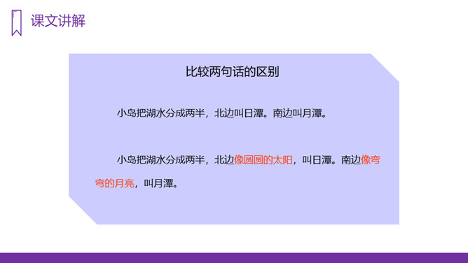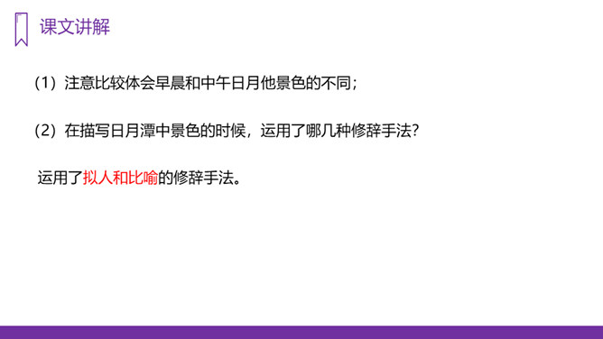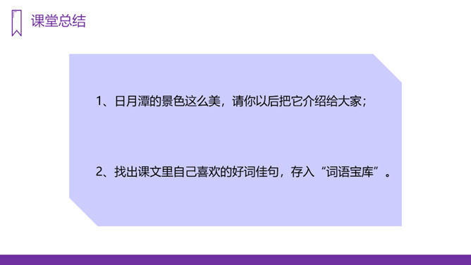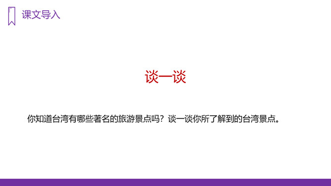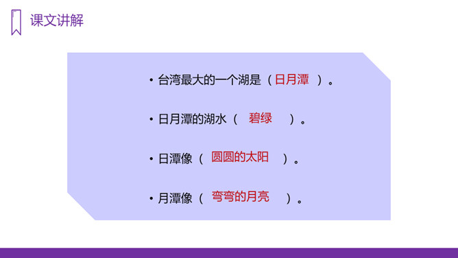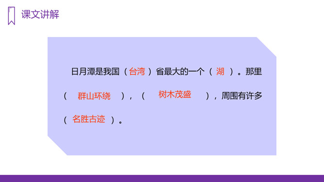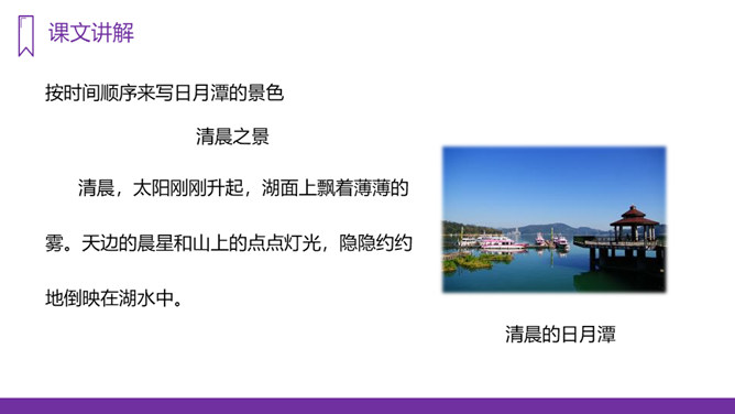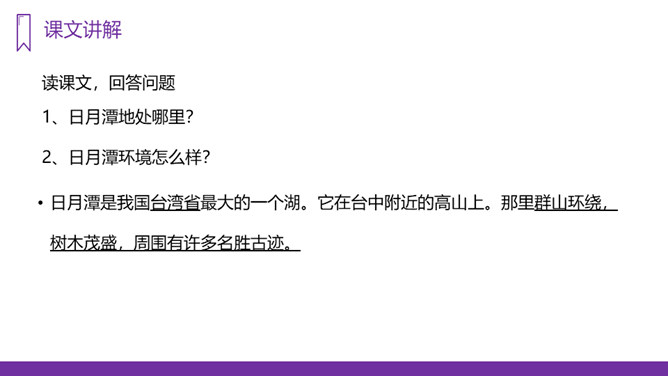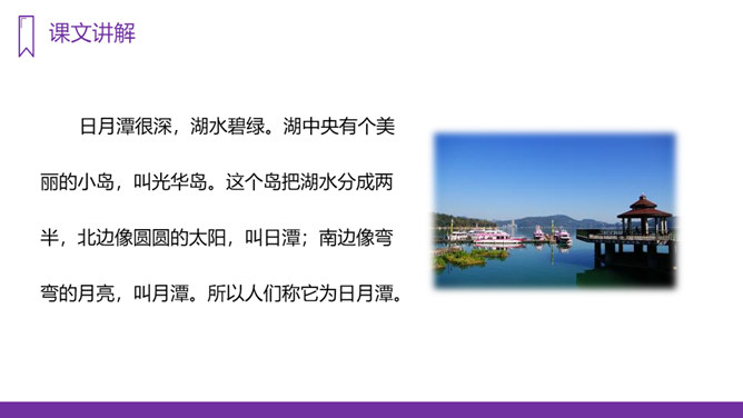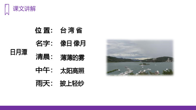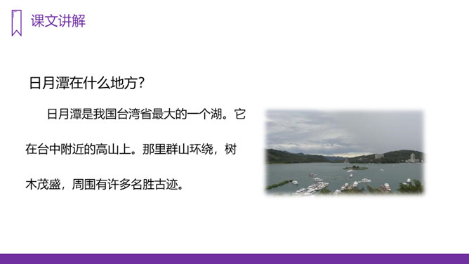 你知道台湾有哪些著名的旅游景点吗?谈一谈你所了解到的台湾景点。读课文,回答问题:1、日月潭地处哪里?2、日月潭环境怎么样?注意比较体会早晨和中午日月他景色的不同;在描写日月潭中景色的时候,运用了哪几种修辞手法?运用了拟人和比喻的修辞手法。、日月潭的景色这么美,请你以后把它介绍给大家;2、找出课文里自己喜欢的好词佳句,存入“词语宝库”。1、向爸爸妈妈或你的好朋友介绍日月潭;2、画画你心中的日月潭;3、搜集有关日月潭的故事和传说,读一读。所属专题:日月潭ppt。