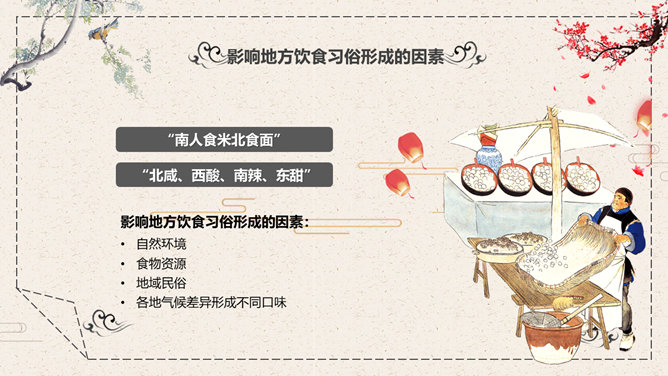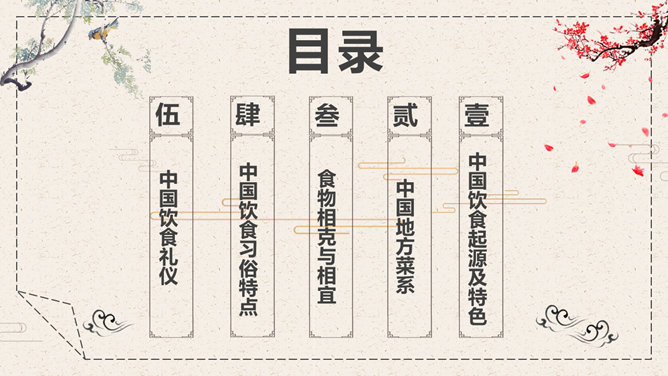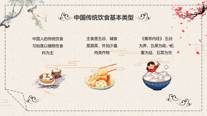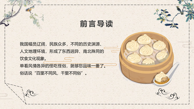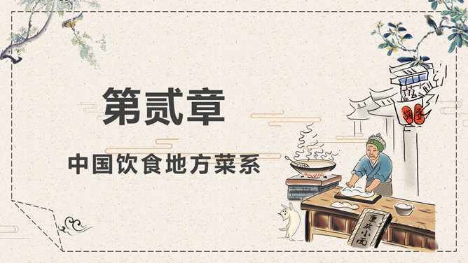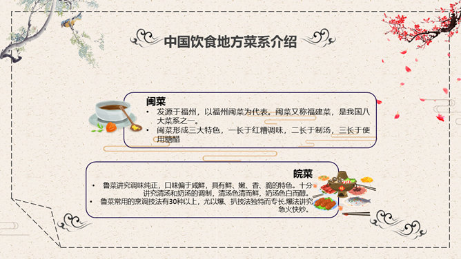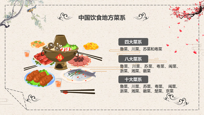 中国美食文化介绍PPT模板。一套介绍中国传统美食饮食文化幻灯片模板,中国风元素设计,动态播放效果。