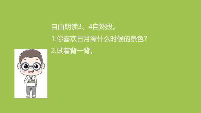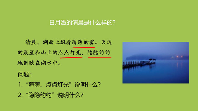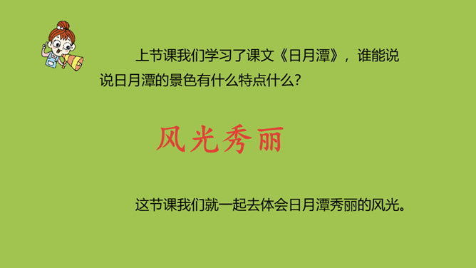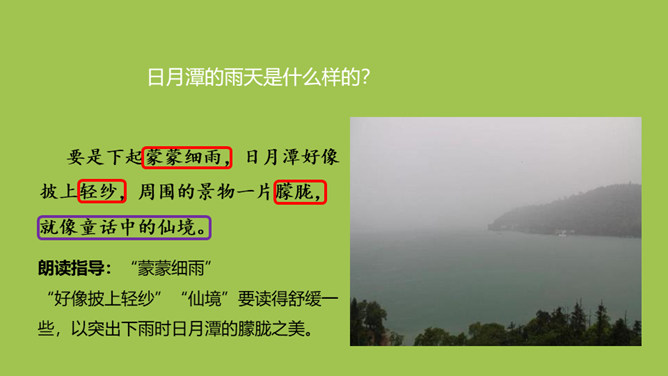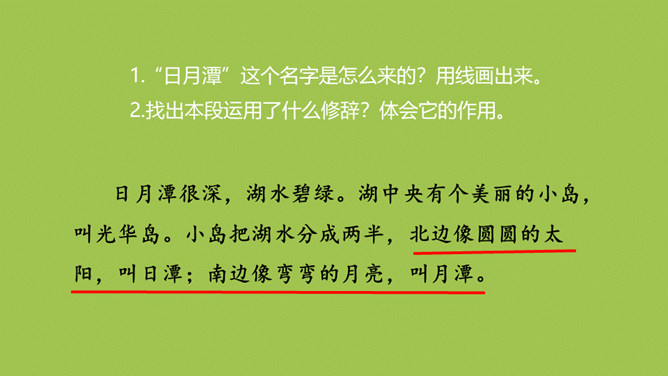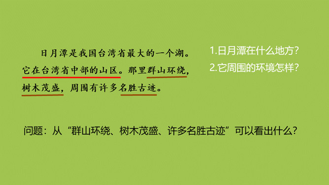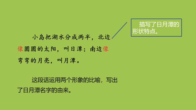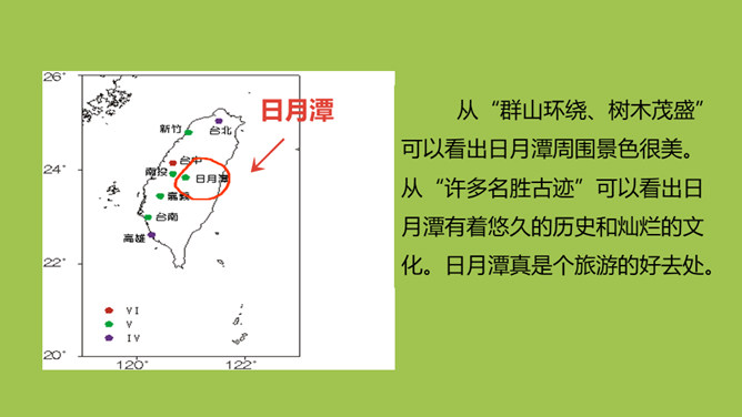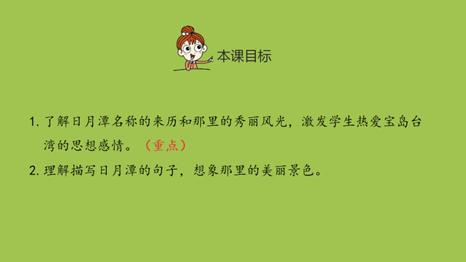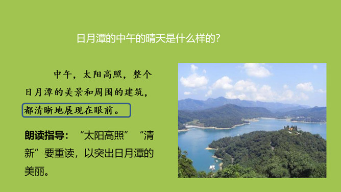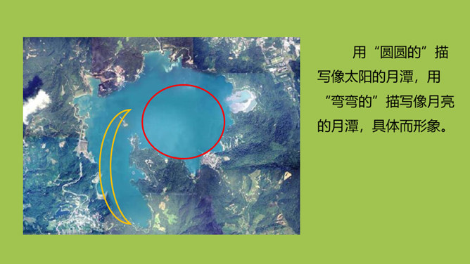 1.了解日月潭名称的来历和那里的秀丽风光,激发学生热爱宝岛台湾的思想感情。(重点)2.理解描写日月潭的句子,想象那里的美丽景色。问题:从“群山环绕、树木茂盛、许多名胜古迹”可以看出什么?1.“日月潭”这个名字是怎么来的?用线画出来。2.找出本段运用了什么修辞?体会它的作用。这段话运用两个形象的比喻,写出了日月潭名字的由来。自由朗读3、4自然段。1.你喜欢日月潭什么时候的景色?2.试着背一背。所属专题:日月潭ppt。