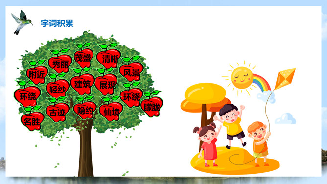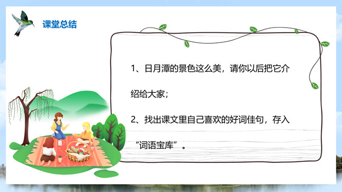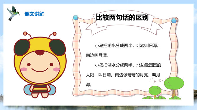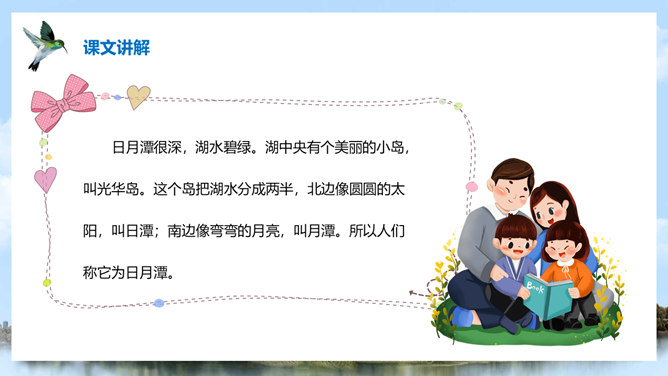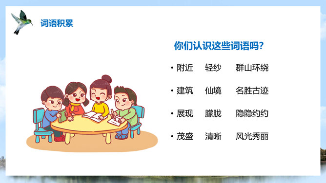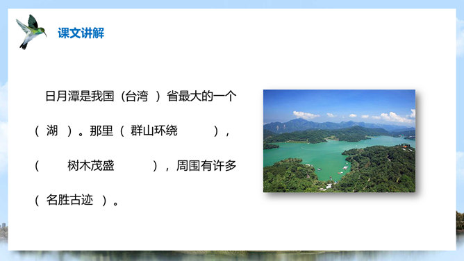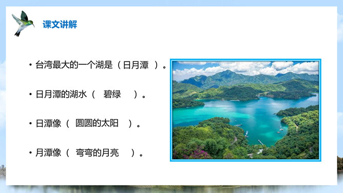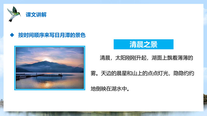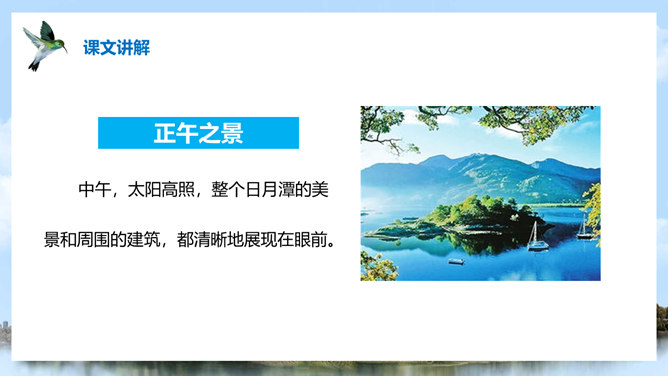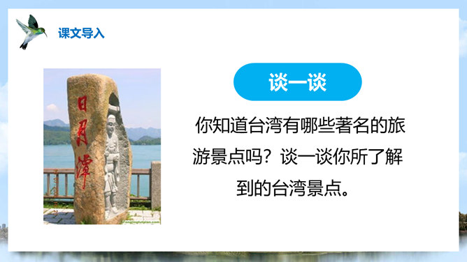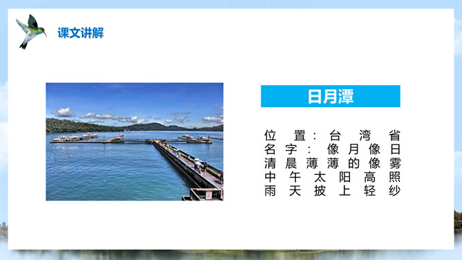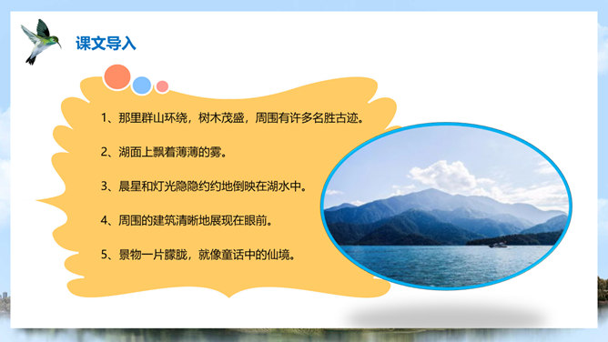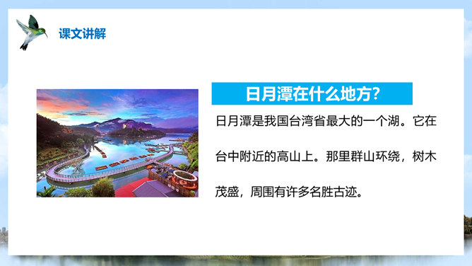 (1)注意比较体会早晨和中午日月他景色的不同;(2)在描写日月潭中景色的时候,运用了哪几种修辞手法?你知道台湾有哪些著名的旅游景点吗?谈一谈你所了解到的台湾景点。1、那里群山环绕,树木茂盛,周围有许多名胜古迹。2、湖面上飘着薄薄的雾。3、晨星和灯光隐隐约约地倒映在湖水中。4、周围的建筑清晰地展现在眼前。5、景物一片朦胧,就像童话中的仙境。日月潭是我国台湾省最大的一个湖。它在台中附近的高山上。那里群山环绕,树木茂盛,周围有许多名胜古迹。所属专题:日月潭ppt。