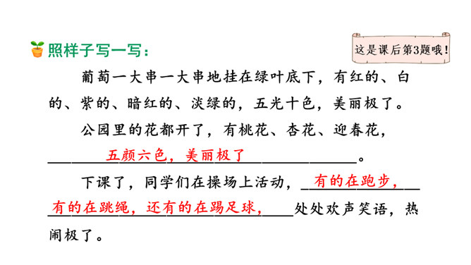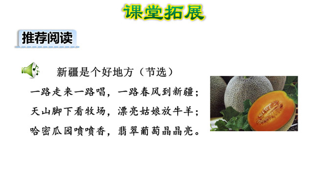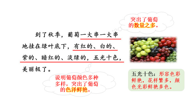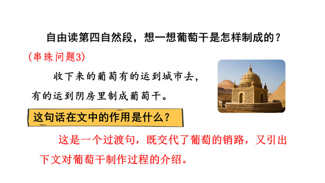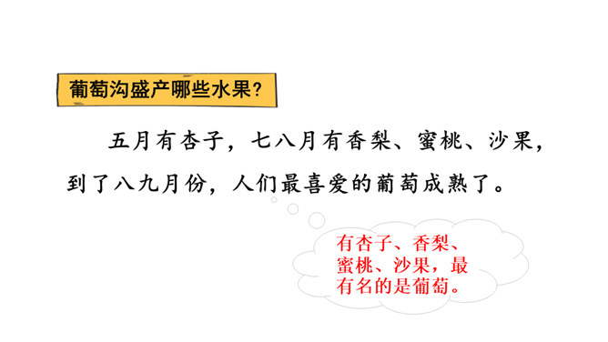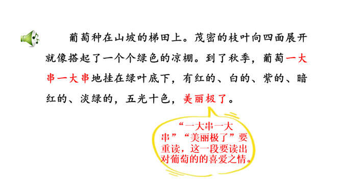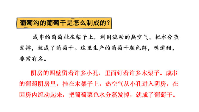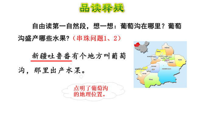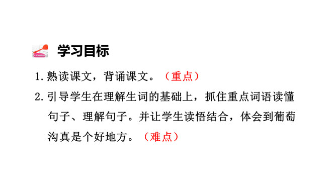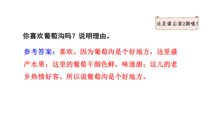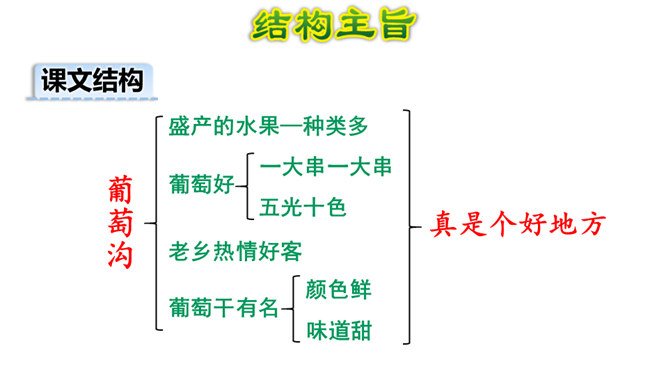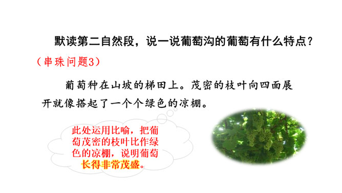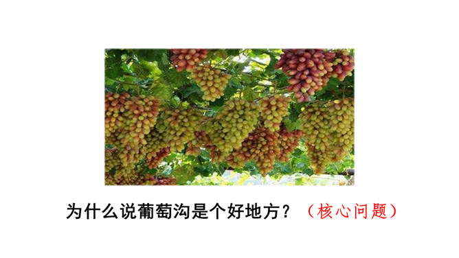1.熟读课文,背诵课文。(重点)2.引导学生在理解生词的基础上,抓住重点词语读懂句子、理解句子。并让学生读悟结合,体会到葡萄沟真是个好地方。(难点)为什么说葡萄沟是个好地方?(核心问题)此处运用比喻,把葡萄茂密的枝叶比作绿色的凉棚,说明葡萄长得非常茂盛。这是一个过渡句,既交代了葡萄的销路,又引出下文对葡萄干制作过程的介绍。本文通过介绍葡萄沟盛产的葡萄的颜色、味道及制作葡萄干的过程,形象生动地说明了葡萄沟是个好地方,表达了作者对葡萄沟的赞美之情。所属专题:葡萄沟ppt。