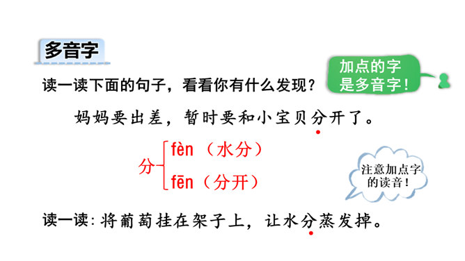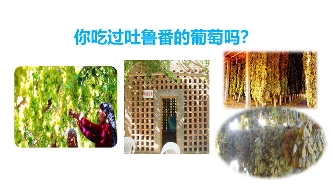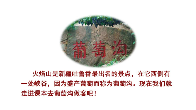火焰山是新疆吐鲁番最出名的景点,在它西侧有一处峡谷,因为盛产葡萄而称为葡萄沟。现在我们就走进课本去葡萄沟做客吧!1.学习本课生字,能正确读写生字词语。2.正确、流利朗读、背诵课文,初步感知数量词的用法。(重点)初读课文后,你感受到了什么?我们从读中感受到了葡萄沟是个好地方。读一读下面的句子,看看你有什么发现?注意加点字的读音!所属专题:葡萄沟ppt。