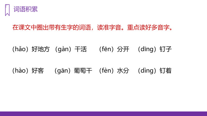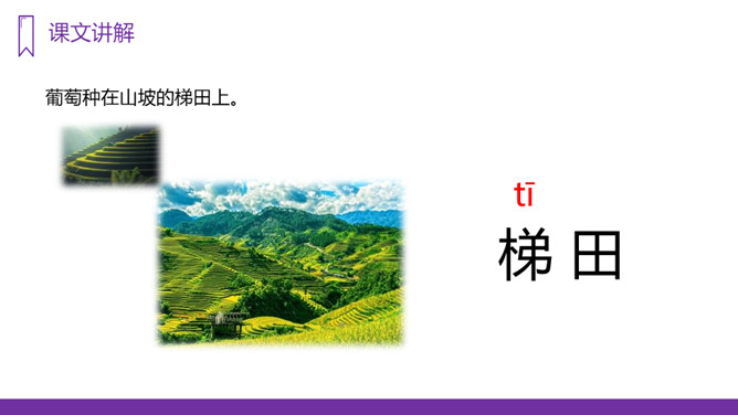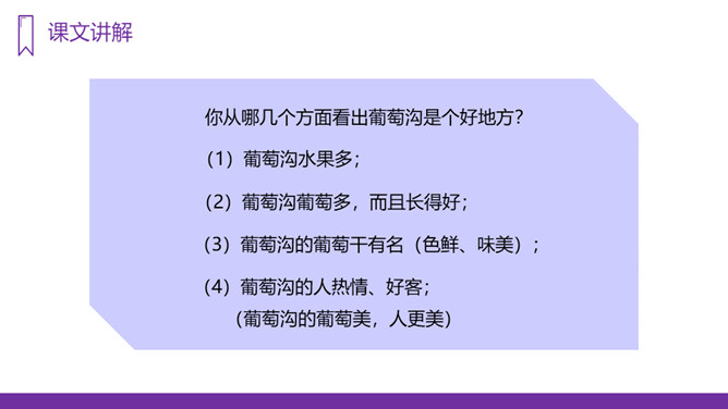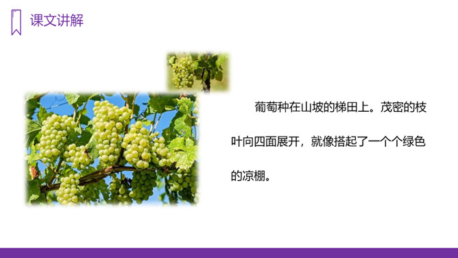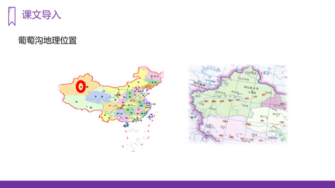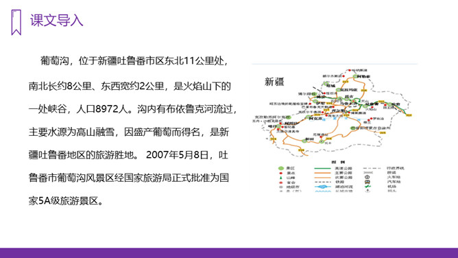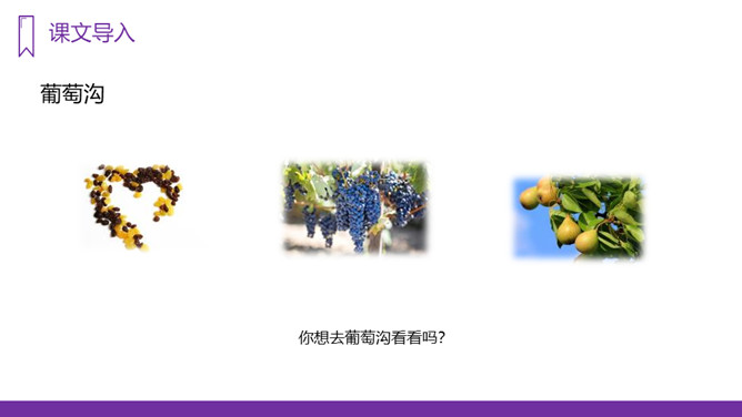 我们的祖国幅员辽阔,物产丰富,塞北江南更是风光各异、景色宜人,让无数的游人流连忘返。今天,老师就要带大家到一个神奇、美丽的地方,那里风光秀丽,盛产水果,最有名的就得数葡萄了,你们知道这是什么地方吗?我们一起走进这块富饶的土地,走进美丽的新疆,去看看有名的葡萄沟。“葡萄沟”这几字都是生字,我们应该怎样记住它们呢?在课文中圈出带有生字的词语,读准字音。重点读好多音字。所属专题:葡萄沟ppt。