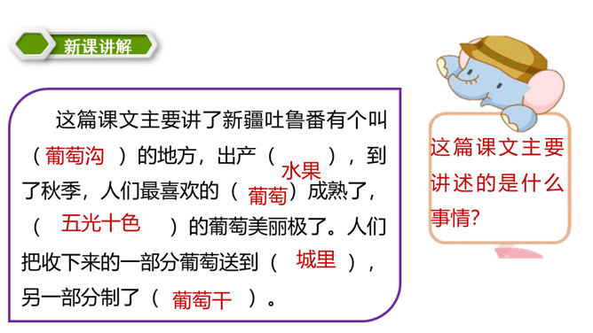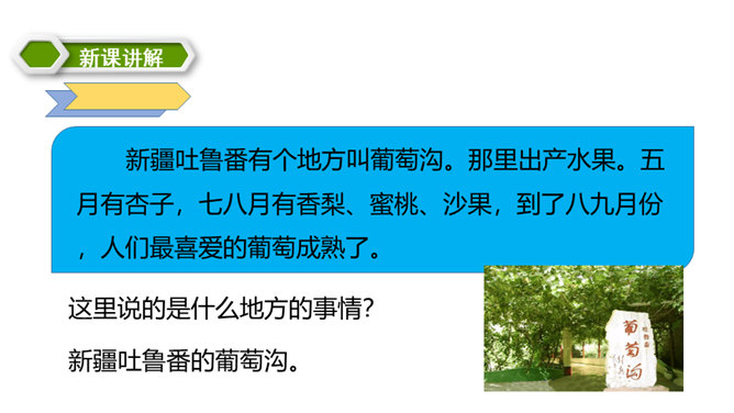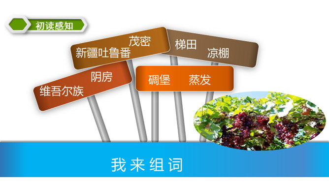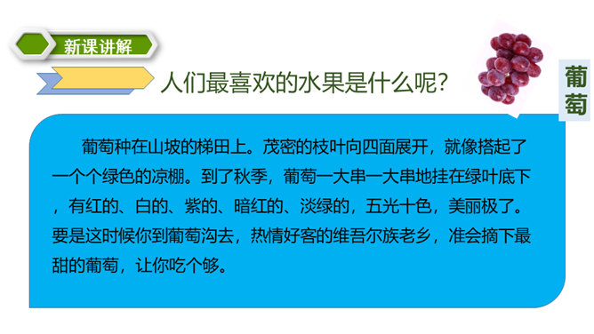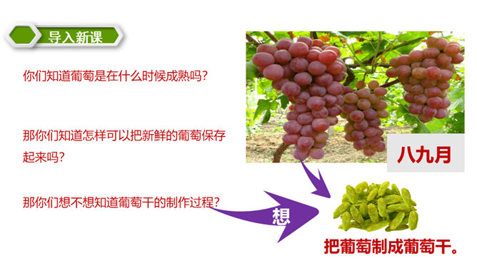 同学们,你们都喜欢吃什么水果呢?在葡萄成熟的时候到葡萄沟去会怎样呢?热情好客的维吾尔族老乡,准会摘下最甜的葡萄,让你吃个够。我知道了葡萄沟生产葡萄,那里的葡萄又大又甜,品种还很多,销往全国各地,为新疆吐鲁番的经济发展作出了很大的贡献,还知道了葡萄沟真是一个美丽的地方。这篇课文向我们介绍了我国新疆吐鲁番的葡萄沟出产的葡萄的情况以及葡萄干的制法,说明了葡萄沟真是个好地方,表达了作者对葡萄沟的赞美之情。所属专题:葡萄沟ppt。