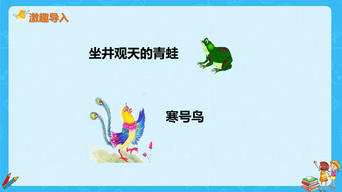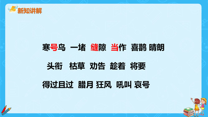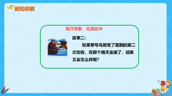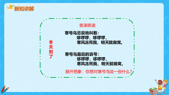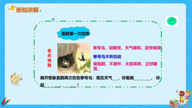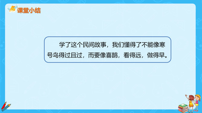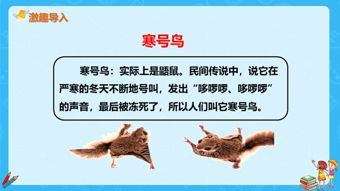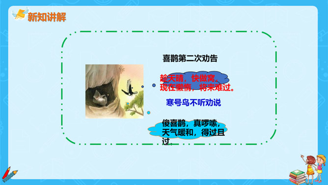 自读要求:(1)自由朗读课文,借助拼音,读准字音,读通句子。(2)画出生字、词语,多读几遍。学了这个民间故事,我们懂得了不能像寒号鸟得过且过,而要像喜鹊,看得远,做得早。1、回家把故事讲给父母听!2、向父母说出你从故事中明白了什么?你在以后的学习、生活中应该怎么做?给生字选择正确的读音。所属专题:寒号鸟ppt。