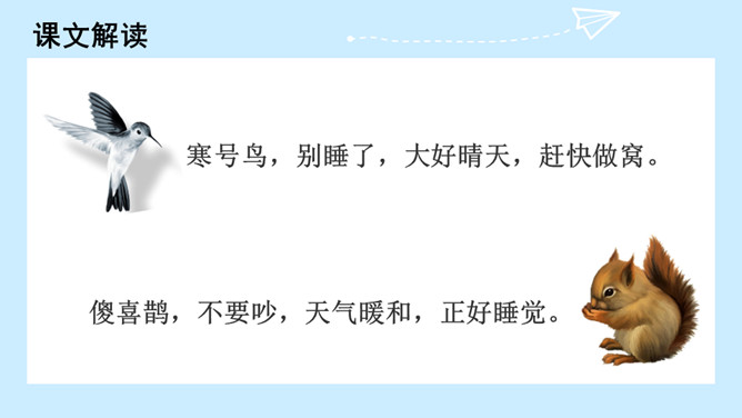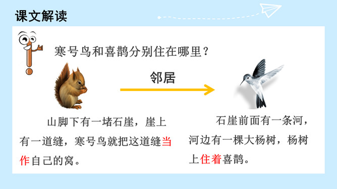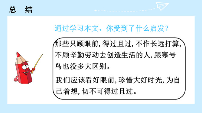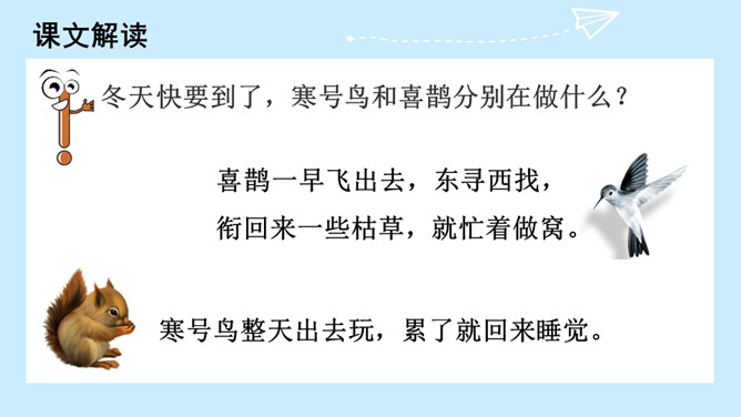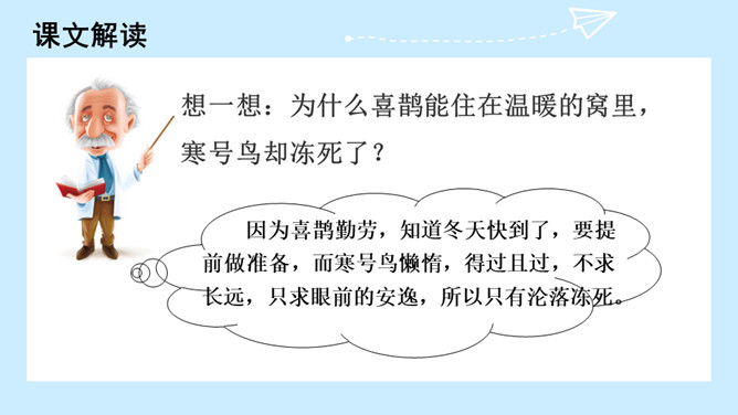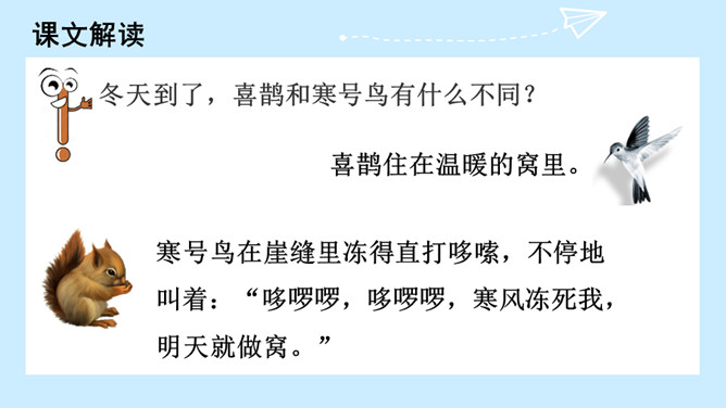 冬天快要到了,寒号鸟和喜鹊分别在做什么?想一想:为什么喜鹊能住在温暖的窝里,寒号鸟却冻死了?因为喜鹊勤劳,知道冬天快到了,要提前做准备,而寒号鸟懒惰,得过且过,不求长远,只求眼前的安逸,所以只有沦落冻死。通过学习本文,你受到了什么启发?那些只顾眼前,得过且过,不作长远打算,不顾辛勤劳动去创造生活的人,跟寒号鸟也没多大区别。我们应该看好眼前,珍惜大好时光,为自己着想,切不可得过且过。所属专题:寒号鸟ppt。