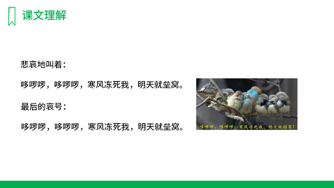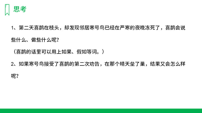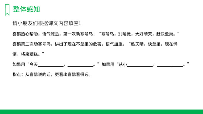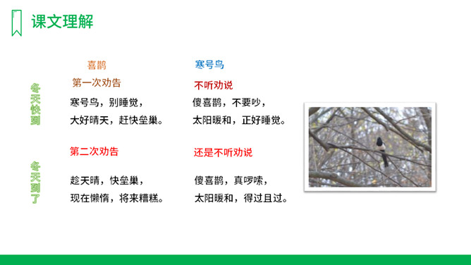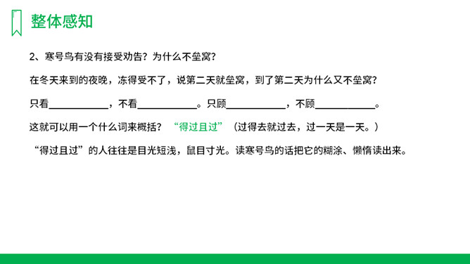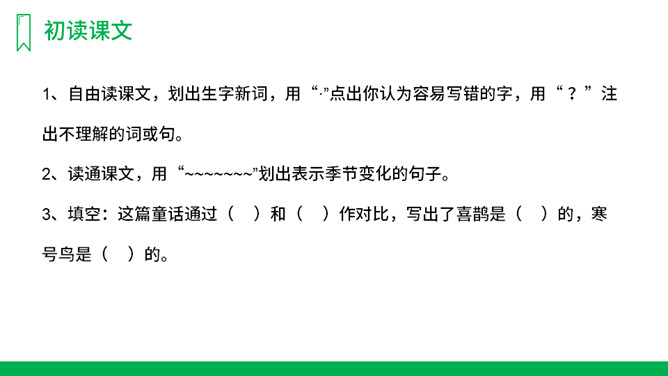 1、自由读课文,划出生字新词,用“·”点出你认为容易写错的字,用“ ?”注出不理解的词或句。2、读通课文,用“~~~~~~~”划出表示季节变化的句子。3、填空:这篇童话通过( )和( )作对比,写出了喜鹊是( )的,寒号鸟是( )的。(写了寒风)用了两个词,一个模拟声音的“呼呼地”,一个表示动作的“刮”,就不是秋风习习地吹着,“寒风腊月……”同样写风,怎么写,告诉我们天气更冷了,打了一个比喻“像狮子一样狂吼”。所属专题:寒号鸟ppt。