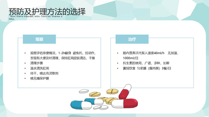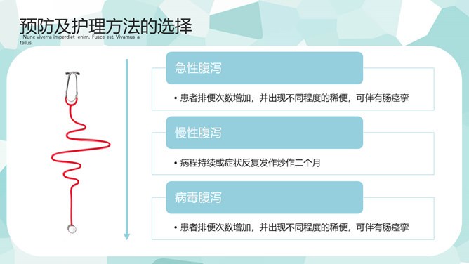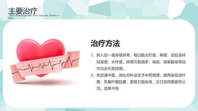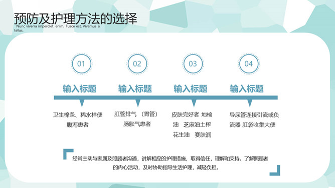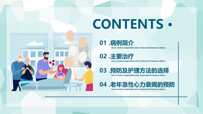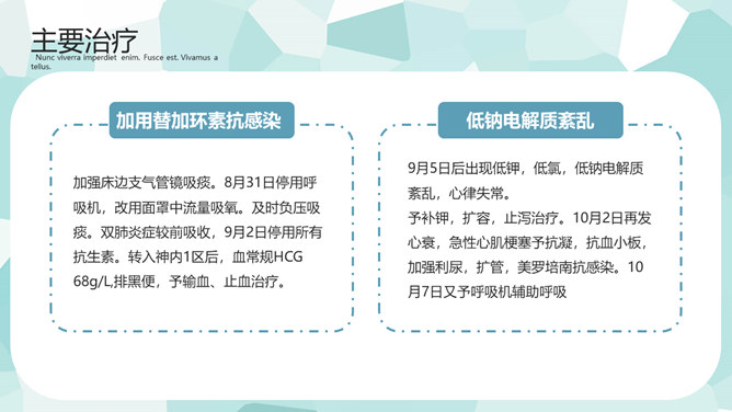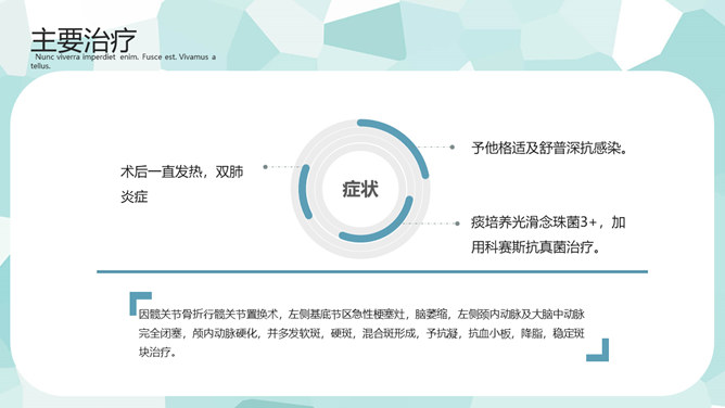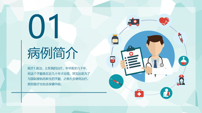 医疗护理疑难病例讨论PPT模板。一套疑难病例讨论幻灯片模板,矢量扁平化设计风格,简约清新,病例简介、主要治疗、预防及护理方法的选择等内容。