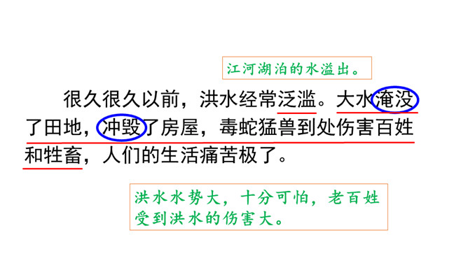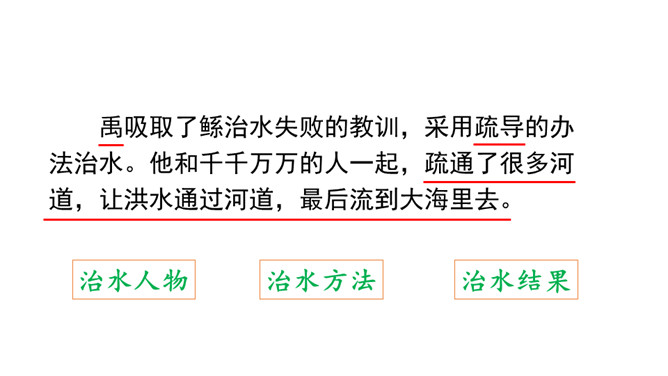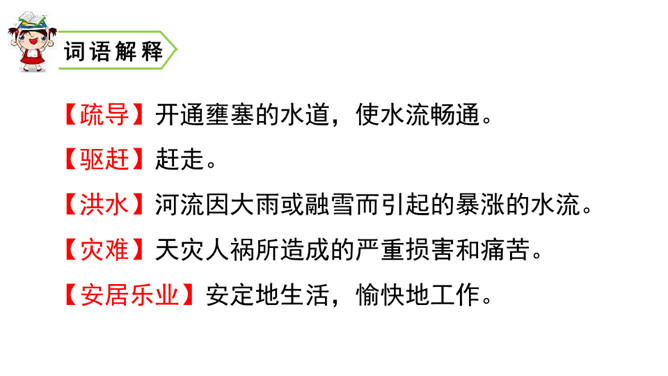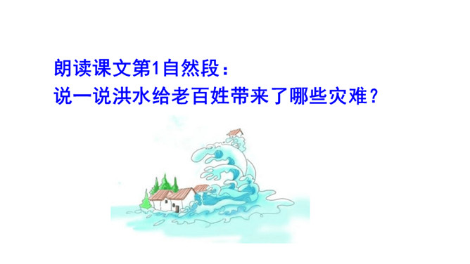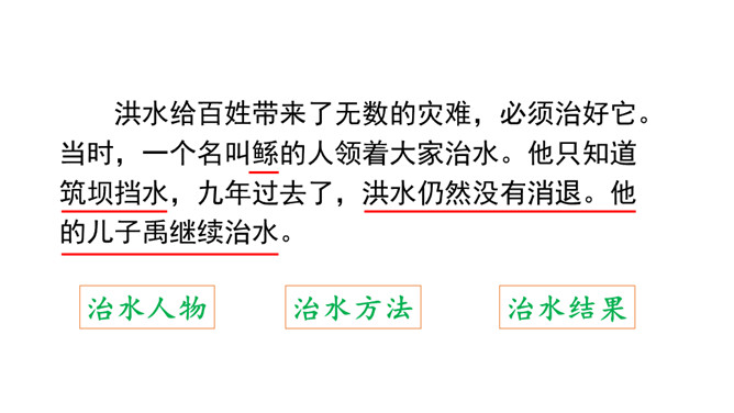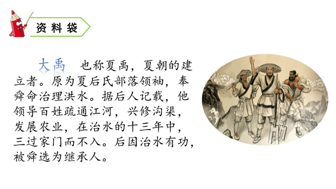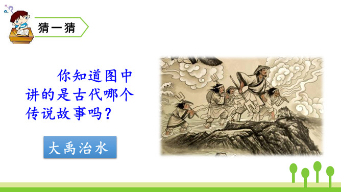 你知道图中讲的是古代哪个传说故事吗?听课文朗读,边听边标出你不懂的词语或句子,并想一想这篇课文讲了一件什么事。朗读课文第1自然段:说一说洪水给老百姓带来了哪些灾难?朗读课文第2自然段:说说谁先来带大家治水?采用了怎样的方法治水?结果怎样?默读3、4自然段:说一说禹又是怎样治水的?结果怎样?从禹治水的过程中你能看出禹是一个什么样的人?找出关键词句读一读,说一说。所属专题:大禹治水ppt。