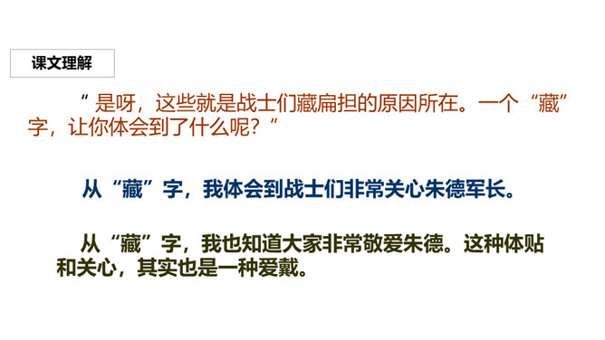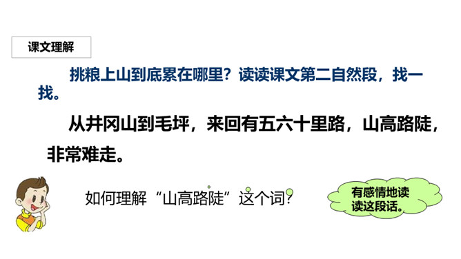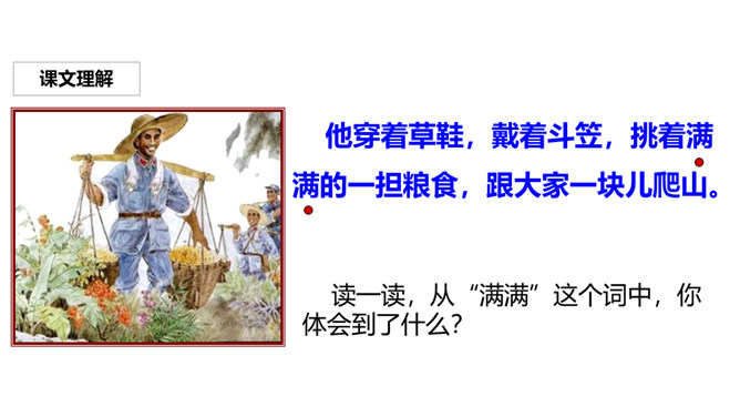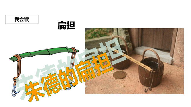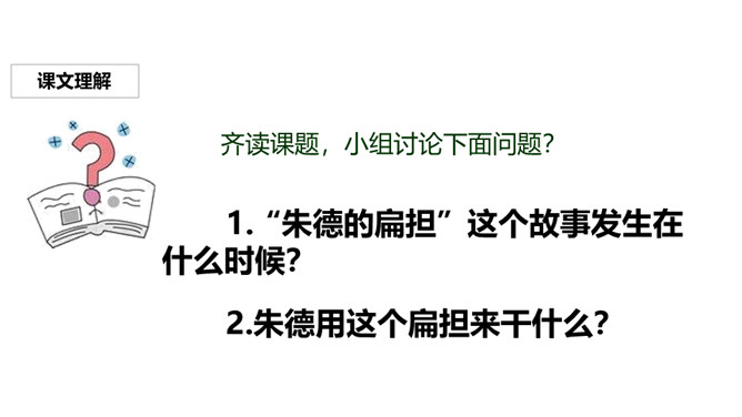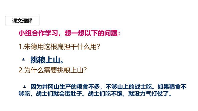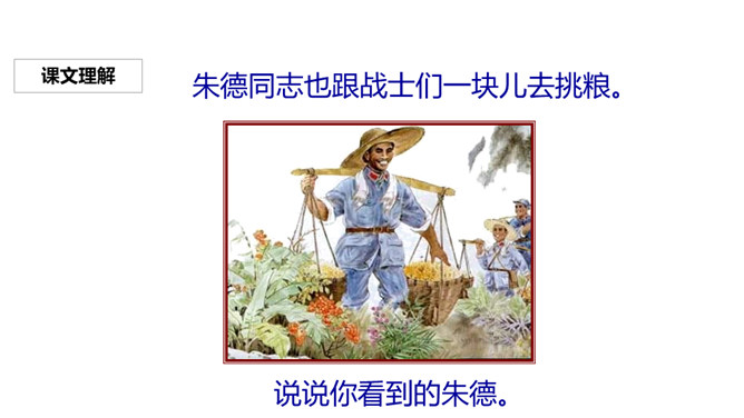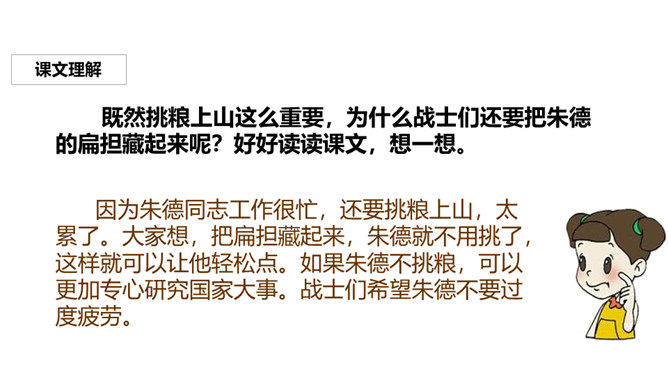 既然挑粮上山这么重要,为什么战士们还要把朱德的扁担藏起来呢?好好读读课文,想一想。 因为朱德同志工作很忙,还要挑粮上山,太累了。大家想,把扁担藏起来,朱德就不用挑了,这样就可以让他轻松点。如果朱德不挑粮,可以更加专心研究国家大事。战士们希望朱德不要过度疲劳。挑粮上山到底累在哪里?读读课文第二自然段,找一找。从井冈山到毛坪,来回有五六十里路,山高路陡,非常难走。所属专题:朱德的扁担ppt。