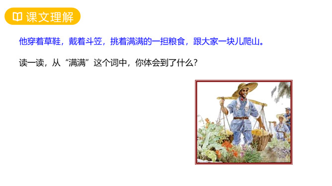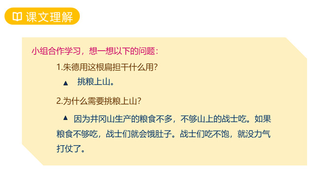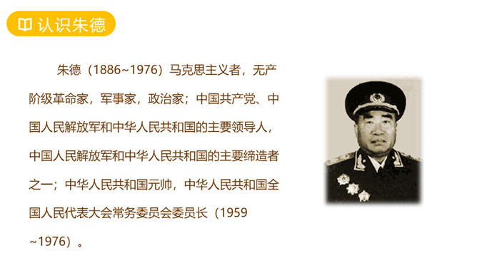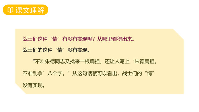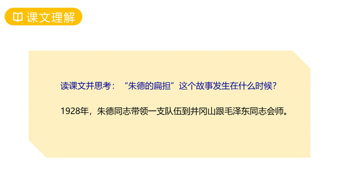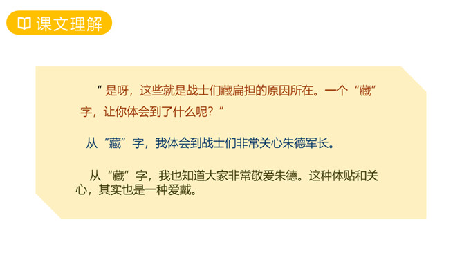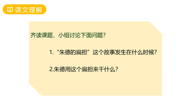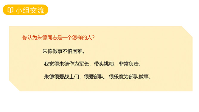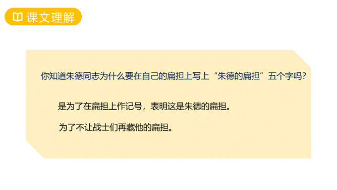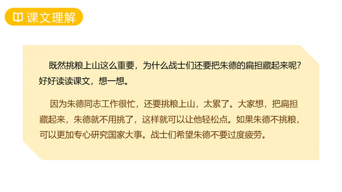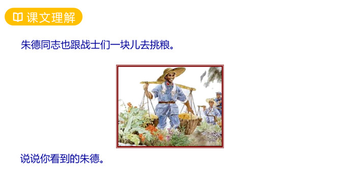 从“藏”字,我也知道大家非常敬爱朱德。这种体贴和关心,其实也是一种爱戴。 你知道朱德同志为什么要在自己的扁担上写上“朱德的扁担”五个字吗?是为了在扁担上作记号,表明这是朱德的扁担。为了不让战士们再藏他的扁担。你认为朱德同志是一个怎样的人?朱德做事不怕困难。 我觉得朱德作为军长,带头挑粮,非常负责。 朱德很爱战士们,很爱部队,很乐意为部队做事。 把这个故事讲给爸爸妈妈听。请阅读《朱德的故事》等课外书。所属专题:朱德的扁担ppt。