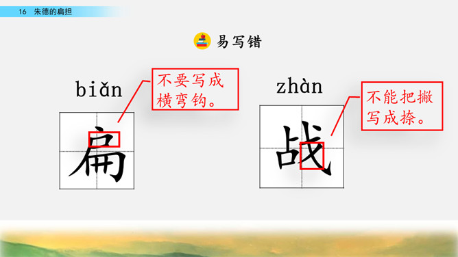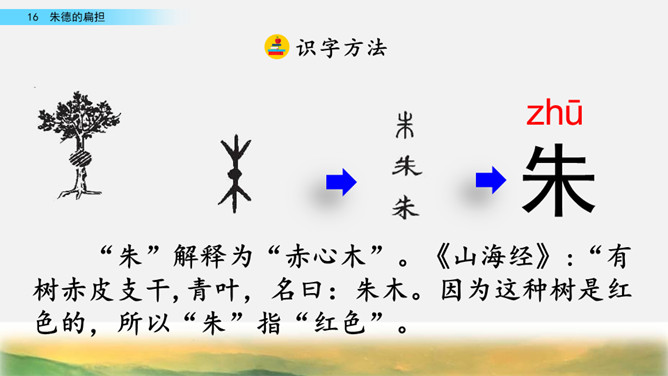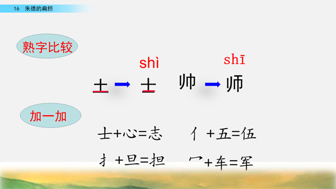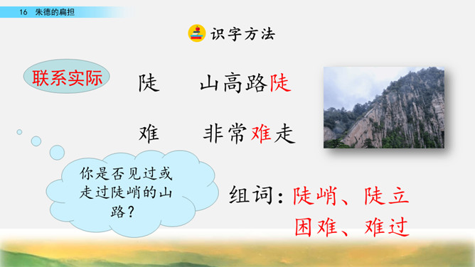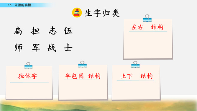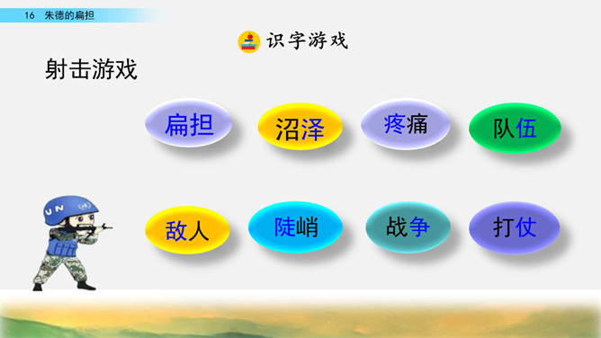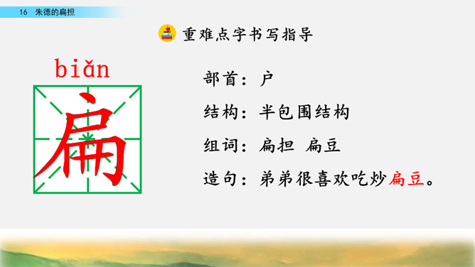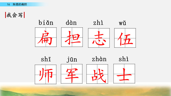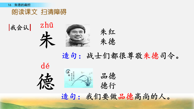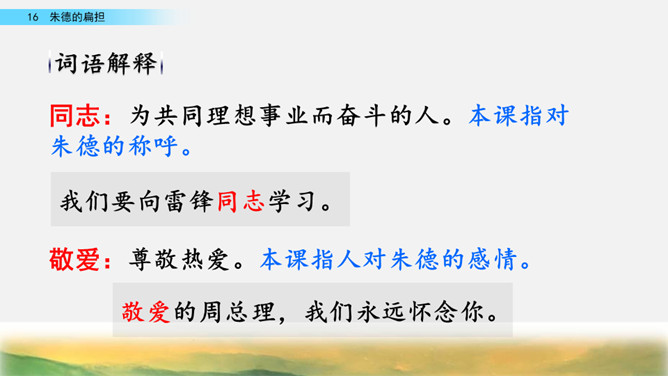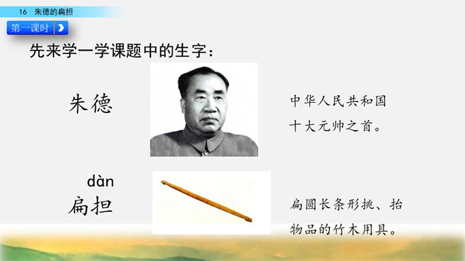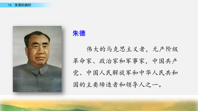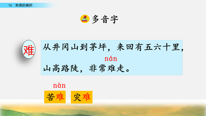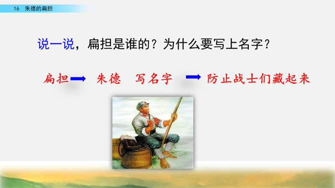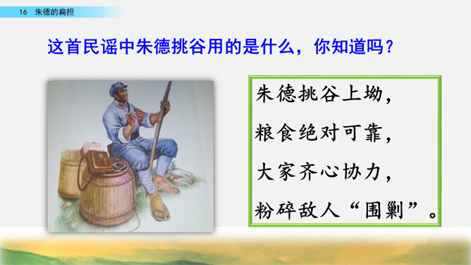 快速读课文,说一说课文讲述了一件什么事。朱德同志和战士们一起去茅坪挑粮的故事。跟着老师一起读第一自然段,读完用自己的话说一说,这一段写了谁,在什么地方,干什么事情?即使面对山下不远处就是敌人的危险情况,红军还是要挑粮,那么你知道他们遇到哪些困难吗?读读第二自然段找找答案吧!“可是”略作停顿,以突出后边的“每次”“争着去”,表现战士们不怕困难、争相挑粮的勇气和热情。所属专题:朱德的扁担ppt。
