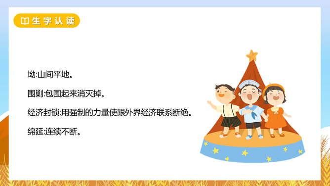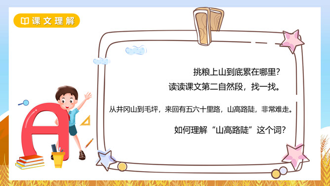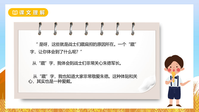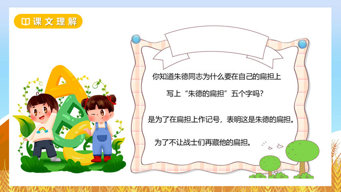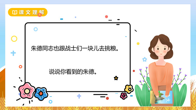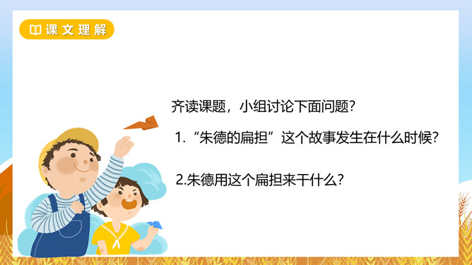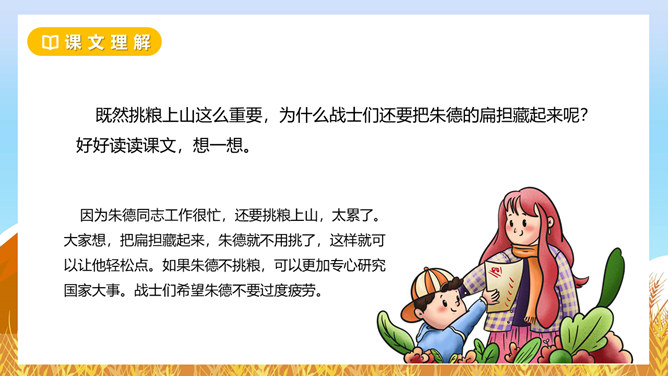 坳:山间平地。围剿:包围起来消灭掉。经济封锁:用强制的力量使跟外界经济联系断绝。绵延:连续不断。齐读课题,小组讨论下面问题?这个故事发生在什么时候?朱德用这个扁担来干什么?挑粮上山到底累在哪里?读读课文第二自然段,找一找。如何理解“山高路陡”这个词?读课文并思考:“朱德的扁担”这个故事发生在什么时候?战士们这种“情”有没有实现呢?从哪里看得出来。读一读,从“满满”这个词中,你体会到了什么?所属专题:朱德的扁担ppt。