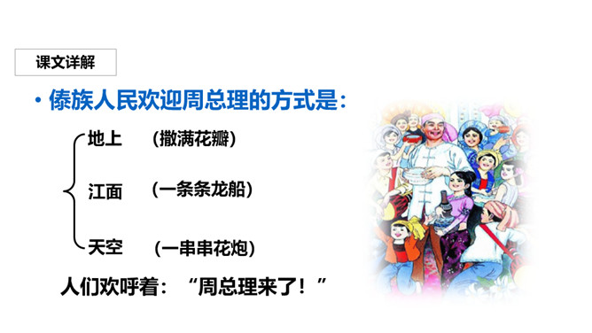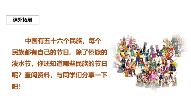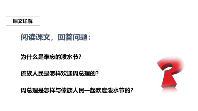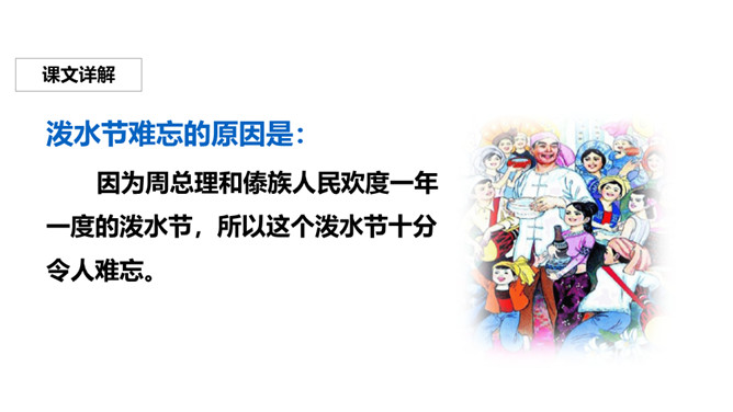 阅读课文,回答问题:为什么是难忘的泼水节?傣族人民是怎样欢迎周总理的?周总理是怎样与傣族人民一起欢度泼水节的?泼水节难忘的原因是:因为周总理和傣族人民欢度一年一度的泼水节,所以这个泼水节十分令人难忘。傣族人民欢迎周总理的方式是:人们欢呼着:“周总理来了!”中国有五十六个民族,每个民族都有自己的节日。除了傣族的泼水节,你还知道哪些民族的节日呢?查阅资料,与同学们分享一下吧!所属专题:难忘的泼水节ppt。