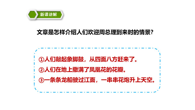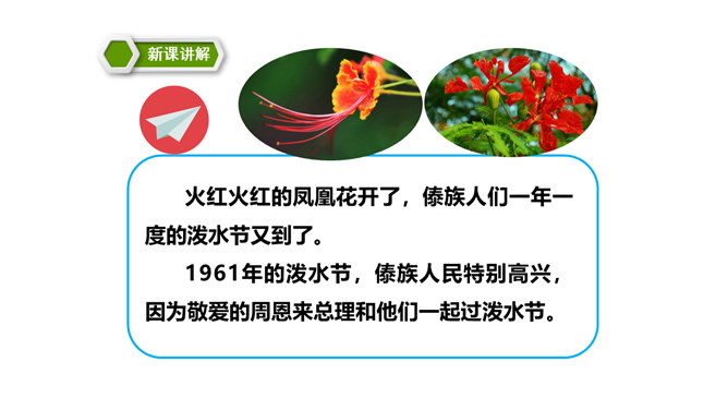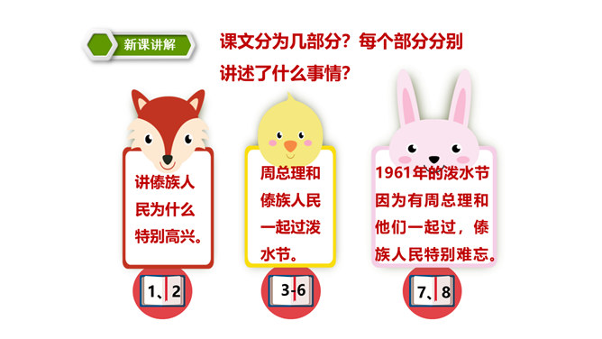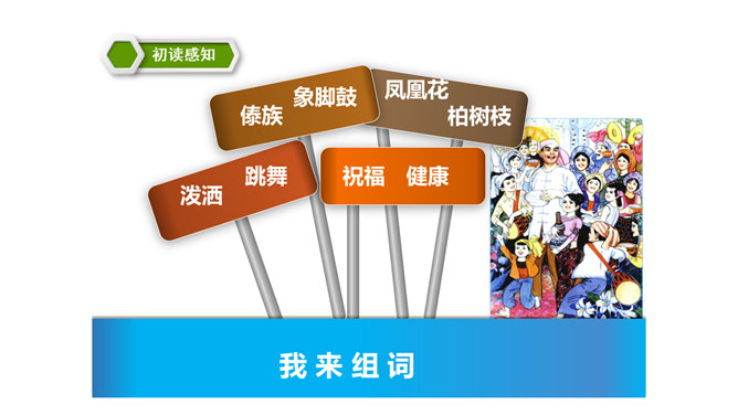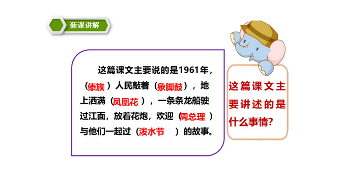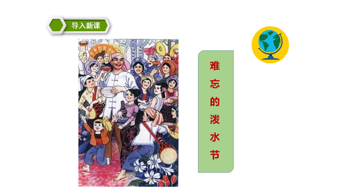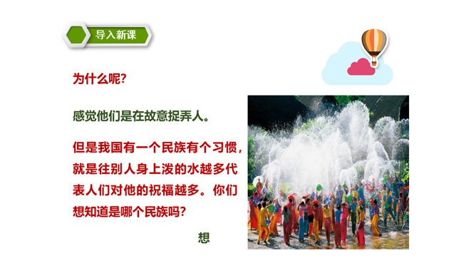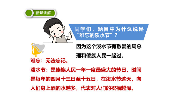 我国有一个民族有个习惯,就是往别人身上泼的水越多代表人们对他的祝福越多。你们想知道是哪个民族吗?人们看到周总理来了之后,是什么样的反映?说明了什么?同学们,你们想,当清清的水泼洒到傣族人民身上时,总理都会送给他们些什么样的祝福呢?这篇课文描写了傣族人民和周总理一起过泼水节的无比幸福的欢乐场景,体现了周总理和傣族人民的深厚感情。用下面的词语,说说周总理是怎样和傣族人民一起过泼水节的。所属专题:难忘的泼水节ppt。