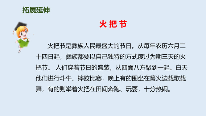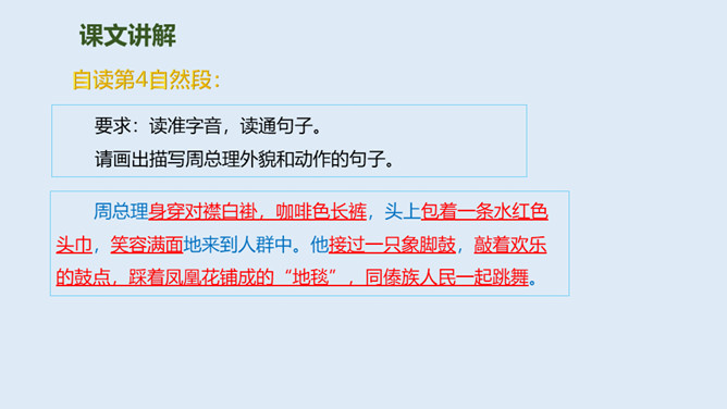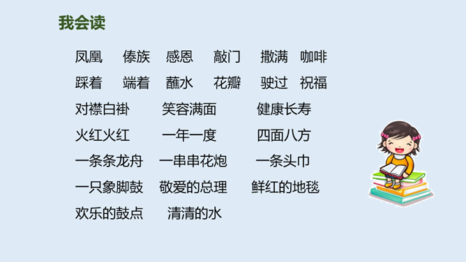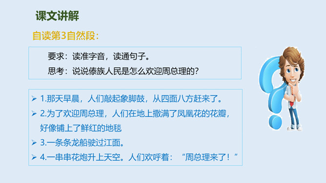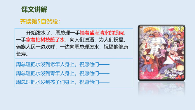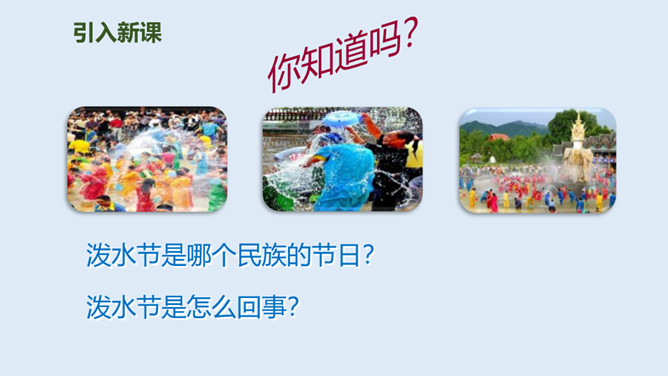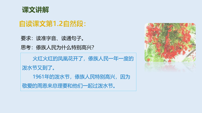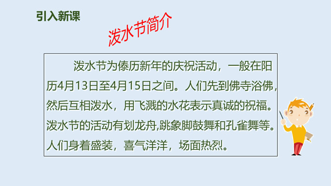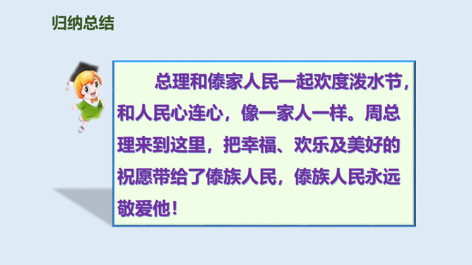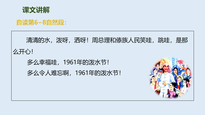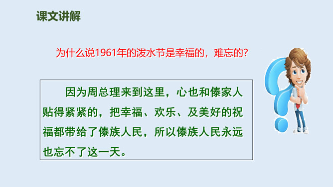 泼水节是哪个民族的节日?泼水节是怎么回事?自读课文第1.2自然段:要求:读准字音、读通句子。思考:傣族人民为什么特别高兴?总理和傣家人民一起欢度泼水节,和人民心连心,像一家人一样。周总理来到这里,把幸福、欢乐及美好的祝愿带给了傣族人民,傣族人民永远敬爱他!分享与周恩来总理有关的故事或名言,并谈谈你的感受。为什么说1961年的泼水节是幸福的,难忘的?所属专题:难忘的泼水节ppt。