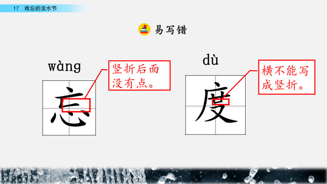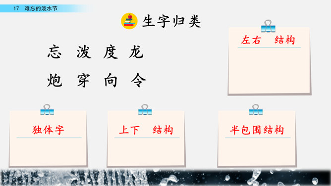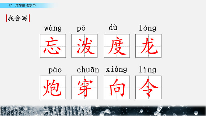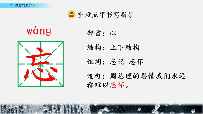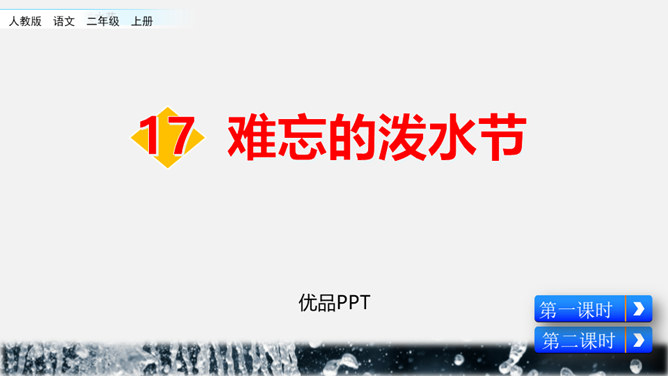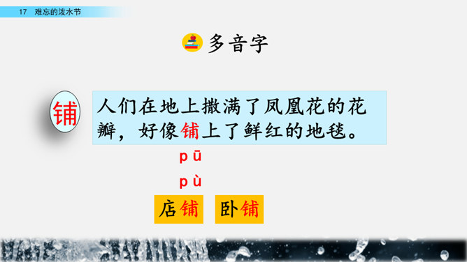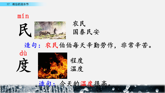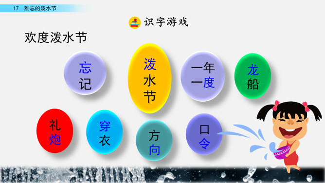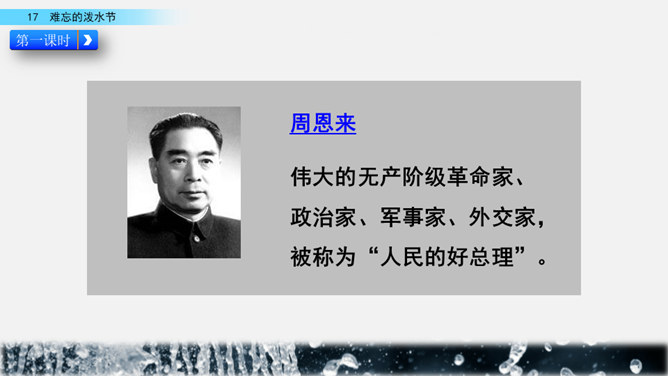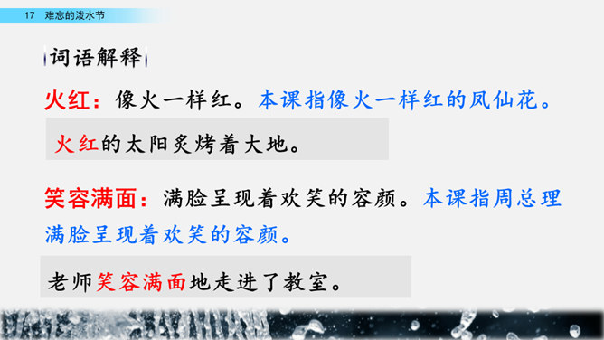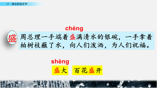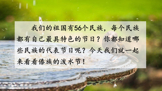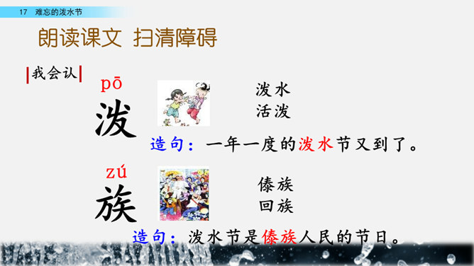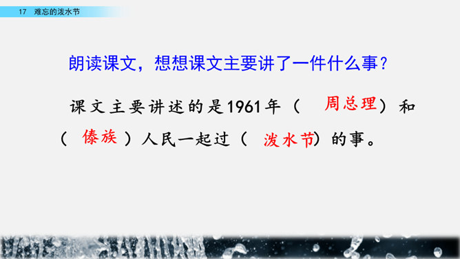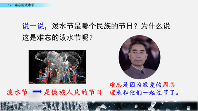 你能结合下面的关键词,说说周总理是怎样和傣族人民一起过泼水节的吗?男女生合作读写周总理与傣族人民互相泼水祝福的情景的语句。齐读第六自然段,语速稍慢,体会人们的心情。周总理来到傣族村寨,把美好的祝愿带给傣族人民,傣族人民永远也忘不了这一天。为什么傣族人民会这样欢迎周总理呢?听老师说完这段资料大家就明白了。周总理是怎样跟傣族人民欢度节日的?用横线画出周总理泼水的句子,用虚线画出傣族人民泼水的句子。所属专题:难忘的泼水节ppt。