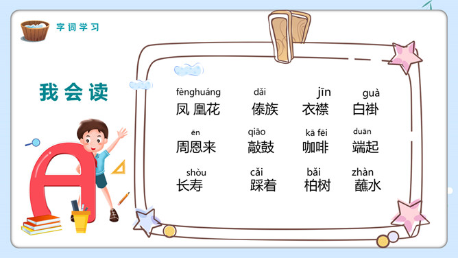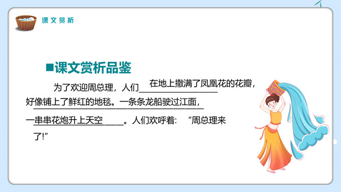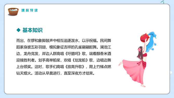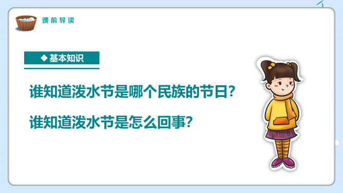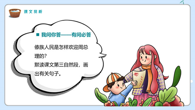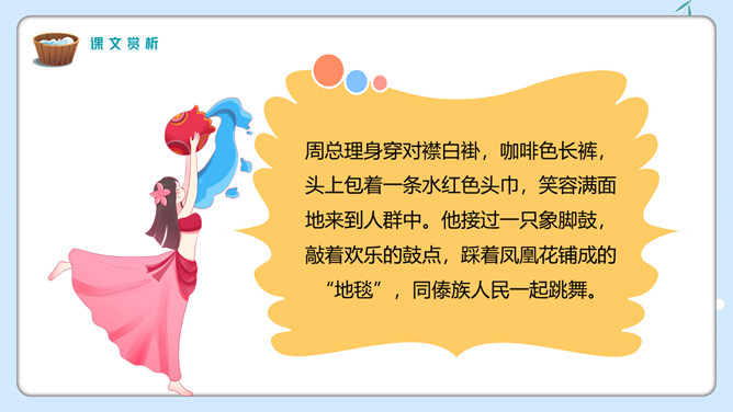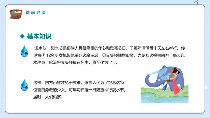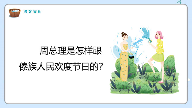 基本知识:谁知道泼水节是哪个民族的节日?谁知道泼水节是怎么回事?傣族人民是怎样欢迎周总理的?默读课文第三自然段,画出有关句子。人们把最鲜红的凤凰花瓣撒在地上表示什么?周总理是怎样跟傣族人民欢度节日的?周恩来是中国共产党、中华人民共和国主要领导人之一,中国人民解放军主要创建人之一,中国无产阶级革命家、政治家、军事家、外交家。 泼水节是傣族人民最隆重的年节和歌舞节日,于每年清明后十天左右举行。所属专题:难忘的泼水节ppt。